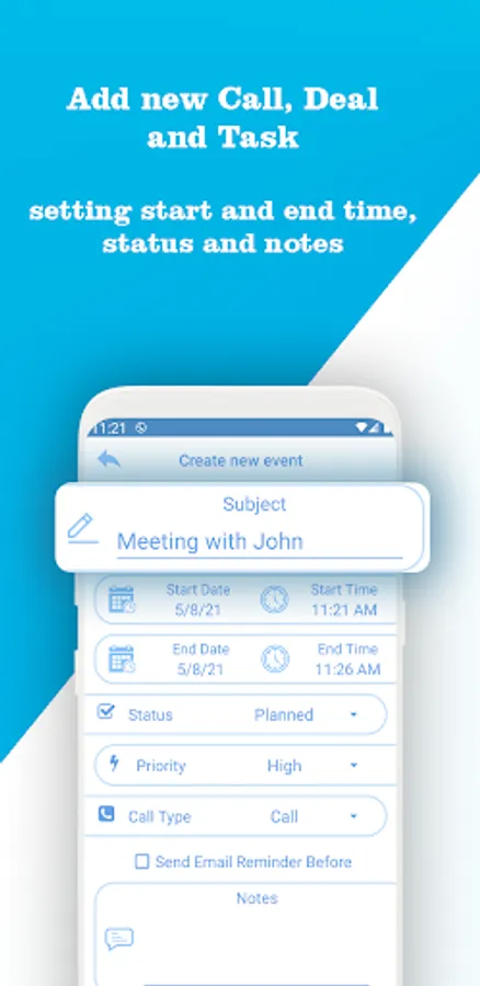 - The app provides you an opportunity to create planned activities into your CRM and set a reminder for them;