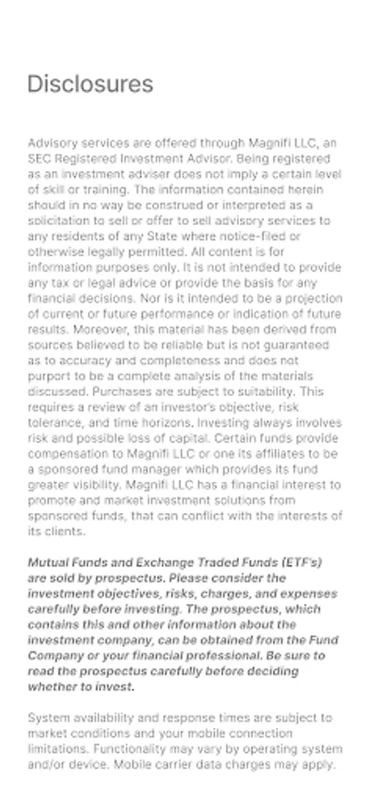 Disclosures: Magnifi LLC does not charge advisory fees or transaction fees for non-managed accounts. Please see Magnifi’s Form ADV for additional information about fees and charges that may apply. Mutual funds or ETFs may have additional fees or expenses. You should review the fund’s prospectus before investing. While Magnifi does not charge commissions or fees on stocks, ETFs or mutual funds, the custodian of your account may charge separately for certain services. Any custodial fees or charges are contained in your customer account agreement.
