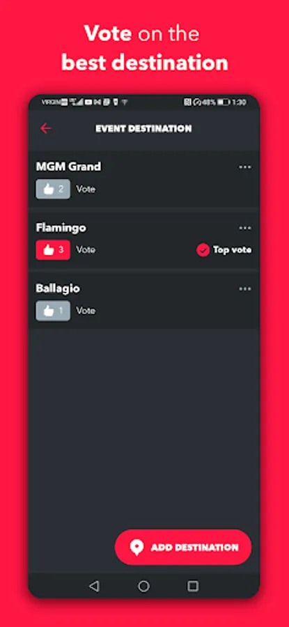 Add multiple destinations and ask event group members to vote on their favorite. Easily include the destination address and website link to give your friends all the details on where they’re headed.