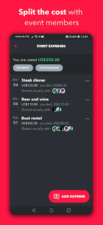 Post your shared event expenses to keep track of who owes what. Split expenses equally and select the members sharing the expense. You can also choose to divide expenses by percentage or unequal amounts.