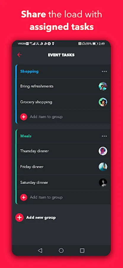 Share the load by assigning tasks to event members. Let everyone know how they can help out and ensure everything gets done. Tasks can be organized into groups. You can also leave tasks unassigned and let event members sign up for tasks themselves.
