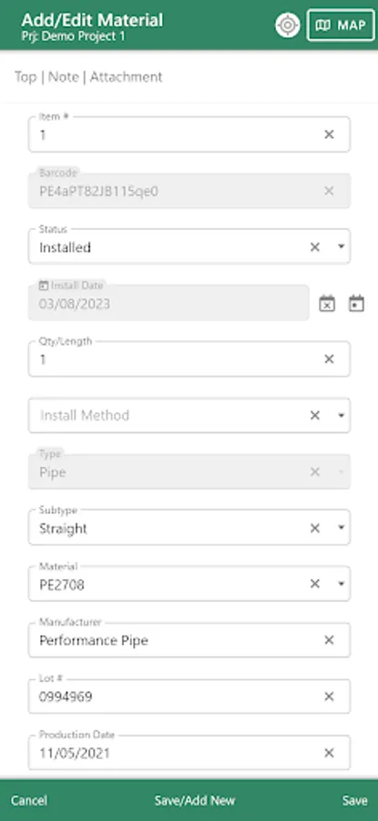 - Data collection forms provided for Material and Service Installations, on-site equipment, Pressure Tests, and more.