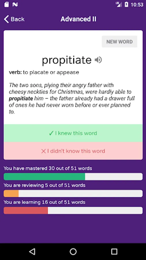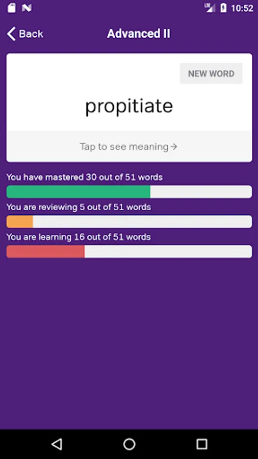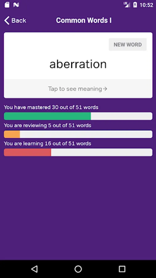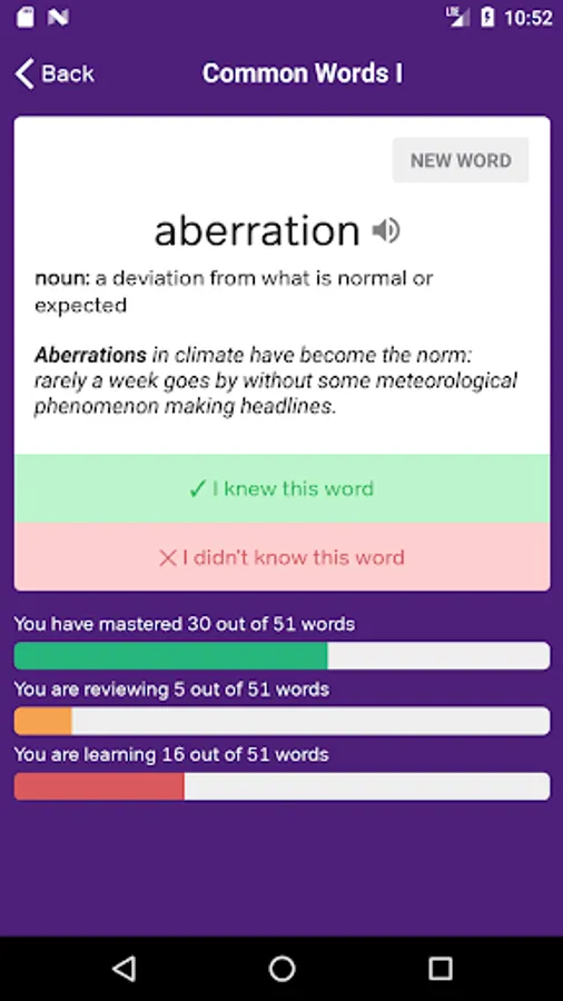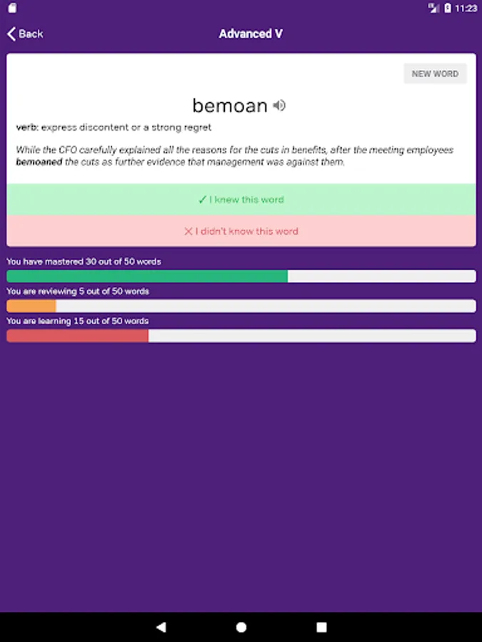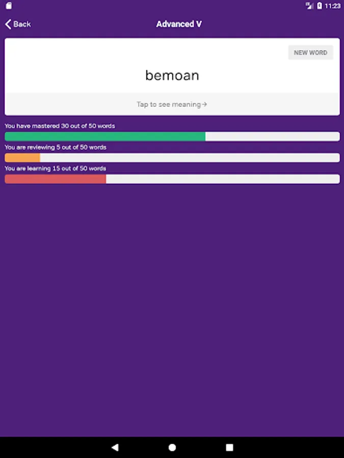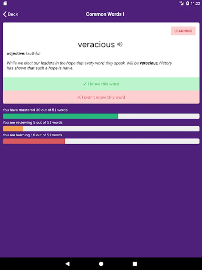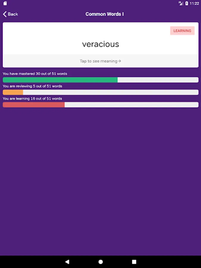 Academic research has found that memories are formed by repeated exposure to new information, so Magoosh’s flashcard app uses a spaced repetition system. Words you are learning will reappear frequently (occurring less frequently the better you know them) and words you already know won’t be repeated. The word list is also culled to only 1000 so that you don't waste time learning unimportant words.