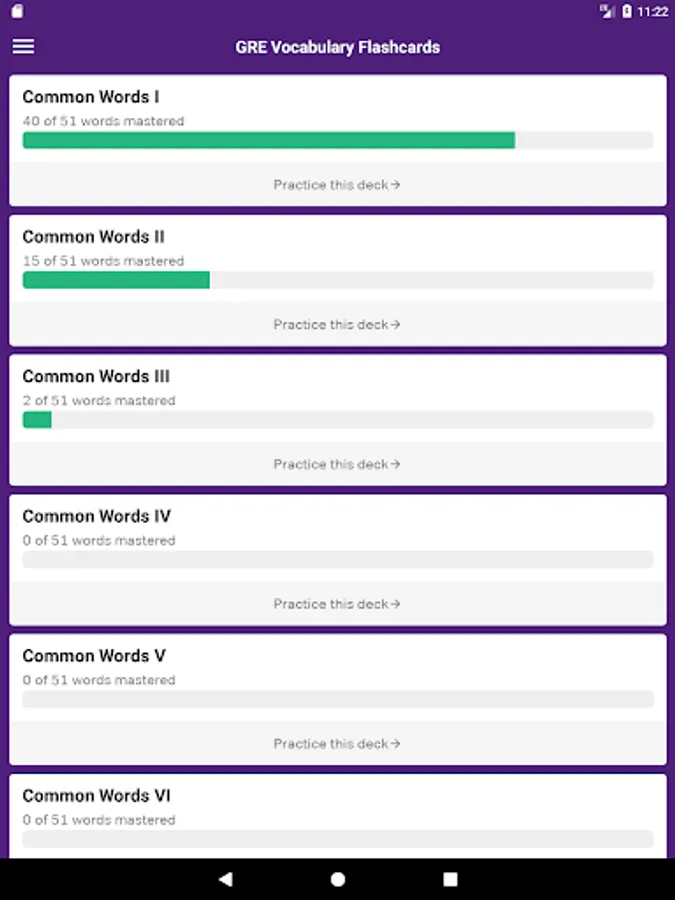 This app gives you free access to all of Magoosh’s GRE flash cards. Sign in with a Magoosh account (or create a new one) to save your progress to the web.
