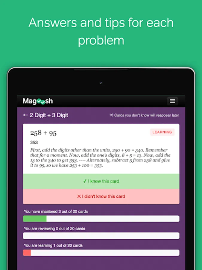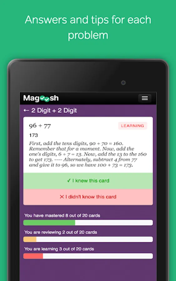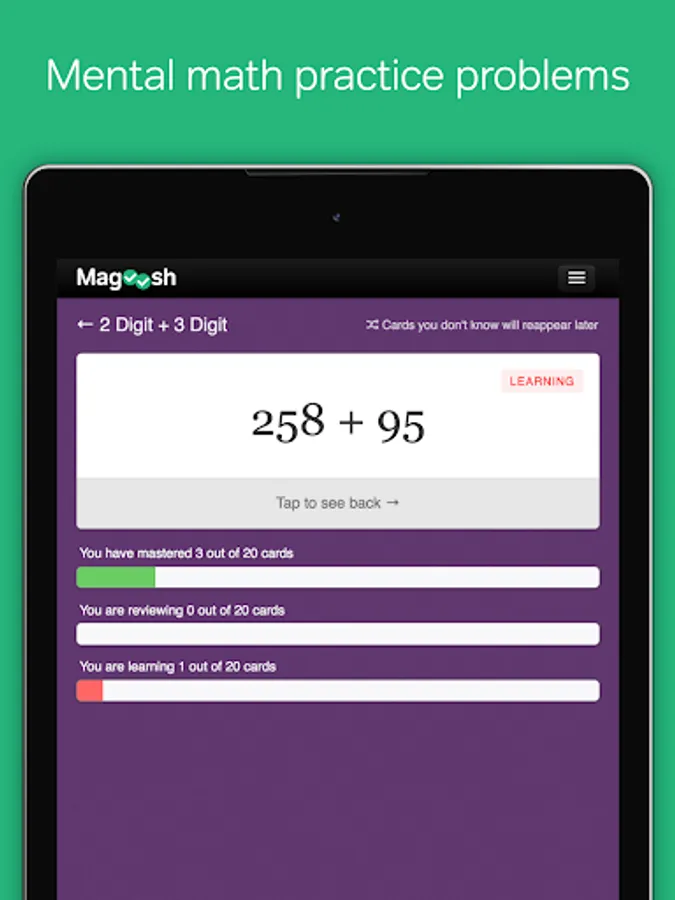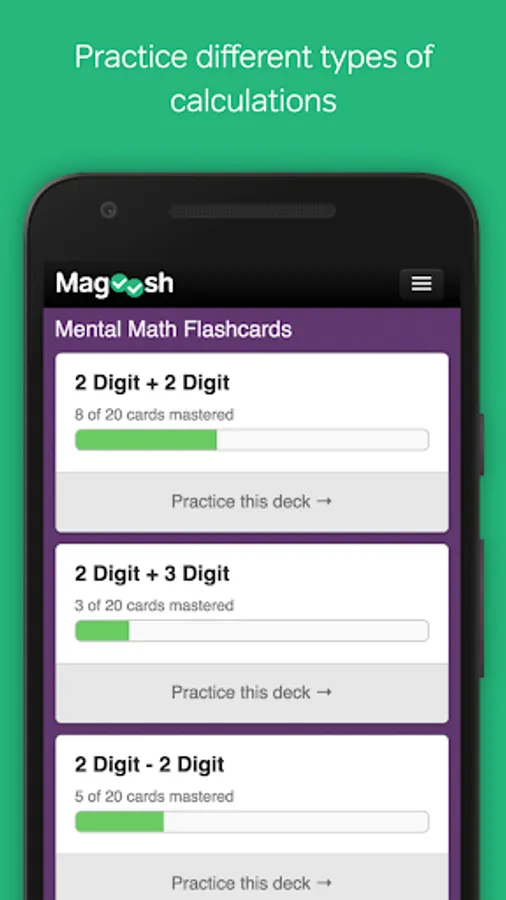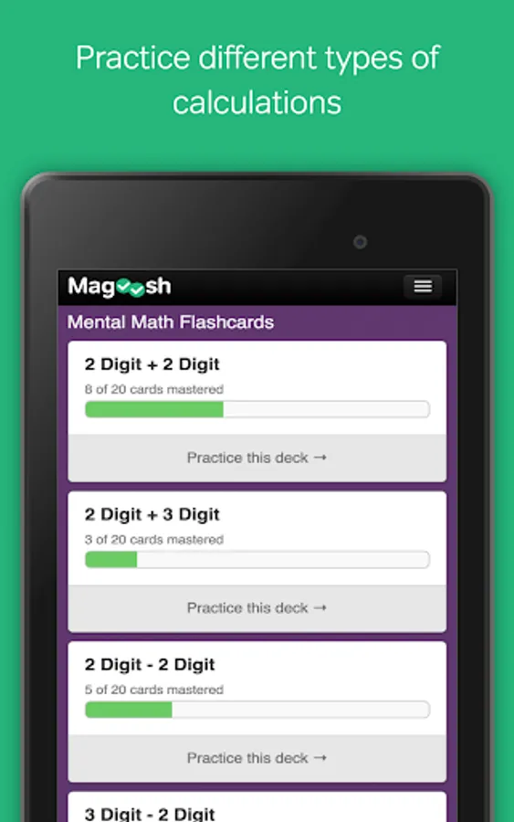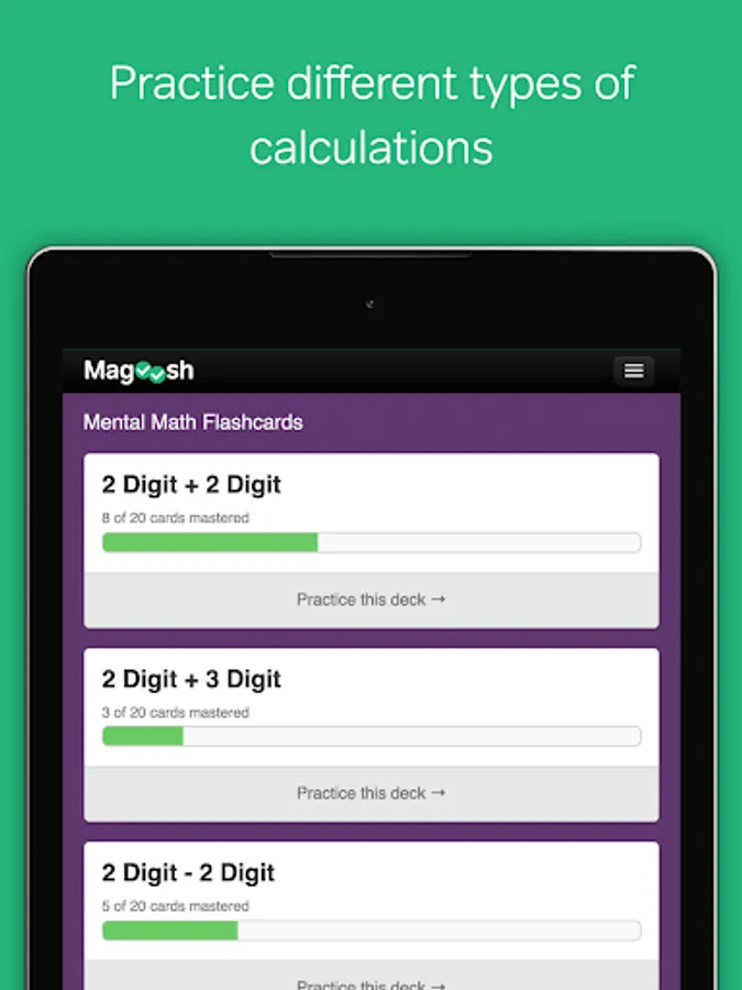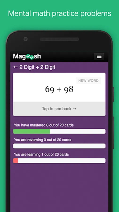 This app gives you free access to Magoosh’s mental math practice online at https://gre.magoosh.com/flashcards/mental-math. Sign in with a Magoosh account (or create a new one) to save your progress to the web.