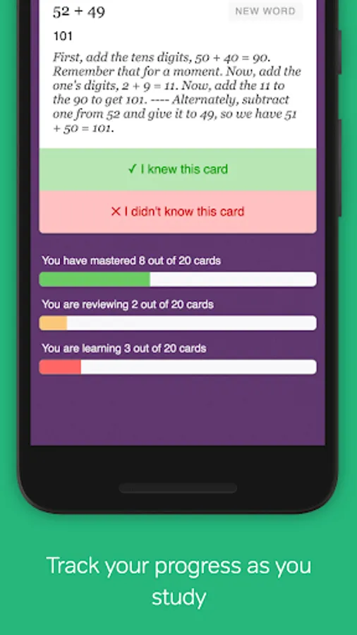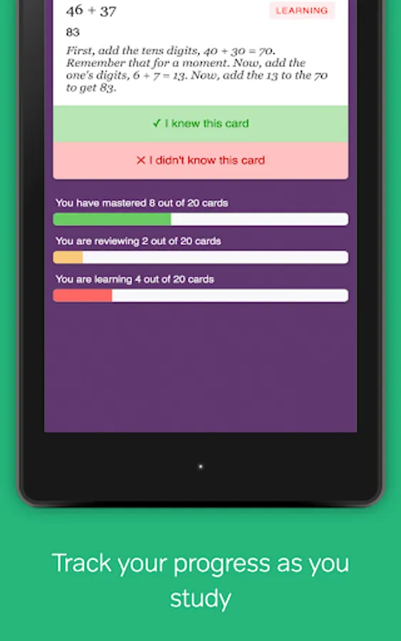 Academic research has found that memories are formed by repeated exposure to new information, so Magoosh’s flashcard app uses a spaced repetition system. Analogies you are learning will reappear frequently (occurring less frequently the better you know them) and analogies you already know won’t be repeated.