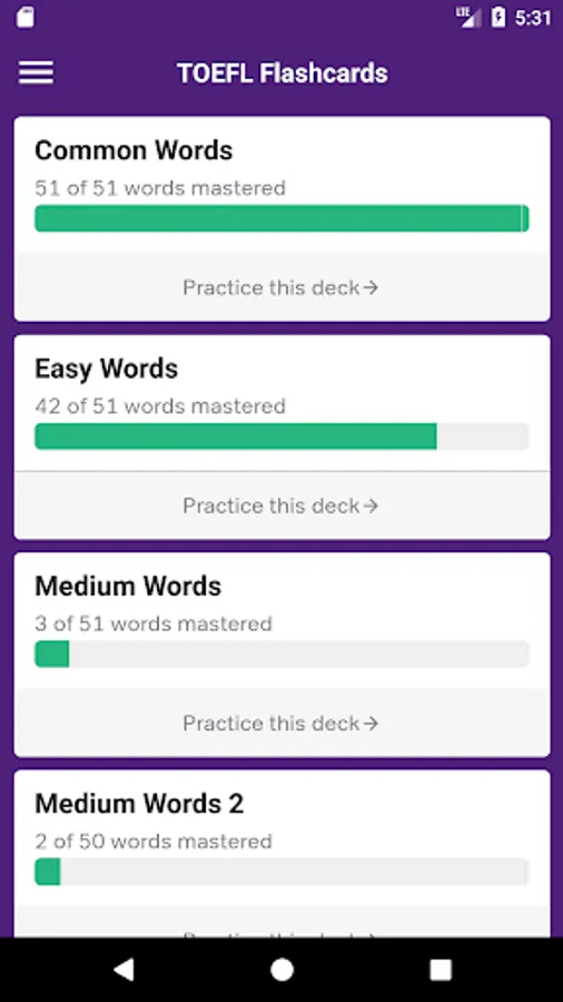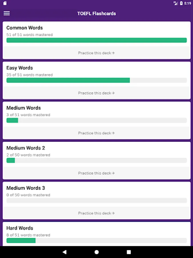 This app gives you free access to all of Magoosh’s TOEFL flash cards. Sign in with a Magoosh account (or create a new one) to save your progress to the web.