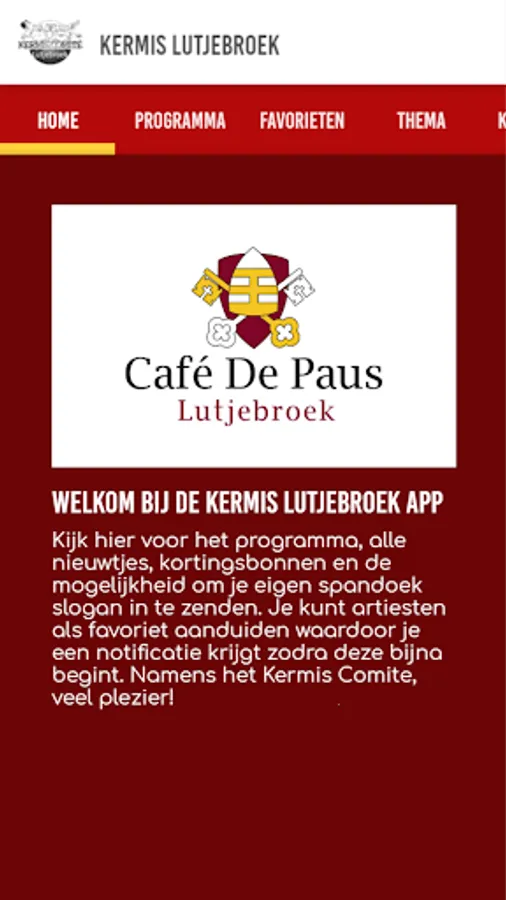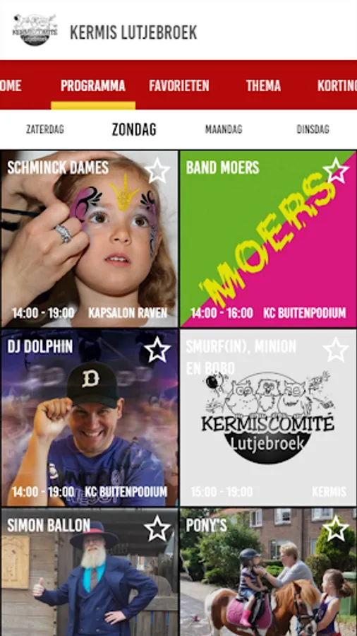 In this app you can see the programs and acts to include the Cafe Pope, Wurf and the fair itself! Click an artist in the program for more information and add it to your schedule so that you get a notification when it is about to start. So you can advance to schedule fun acts and ensure that you do not forget them during the Fair Lutjebroek.