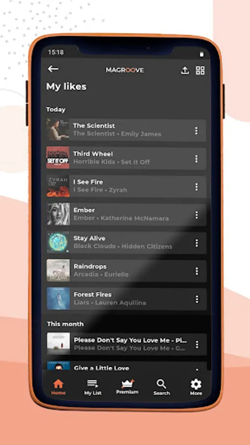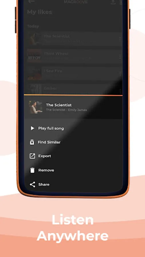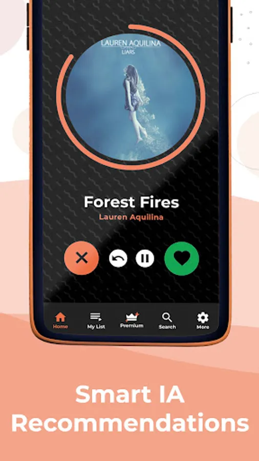 Like or pass. Every song you hit ""like"" goes to your ""My List"", which you can later sync up with Spotify, Apple Music, Deezer or your favorite music streaming service and listen to the full songs there.