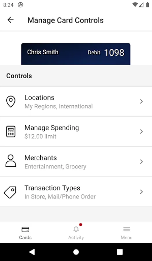 Real-time alerts for PIN and signature transactions keep you informed of your card usage to quickly detect unauthorized or fraudulent activity. Location-Based Controls and Alerts Restrict transactions to merchants near your location (using your phone’s GPS) or by region using city, state, country or zip code on an interactive map.