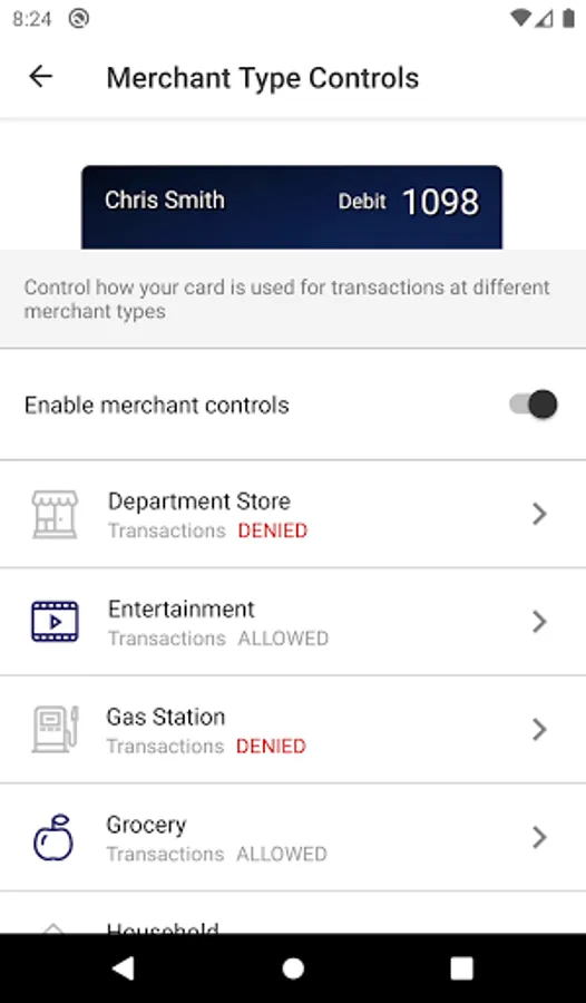 Set spending limits to decline transactions above your thresholds. Monitor activity by category such as gas stations and restaurants, and by type: in-store purchases, e-commerce transactions and ATM transactions.