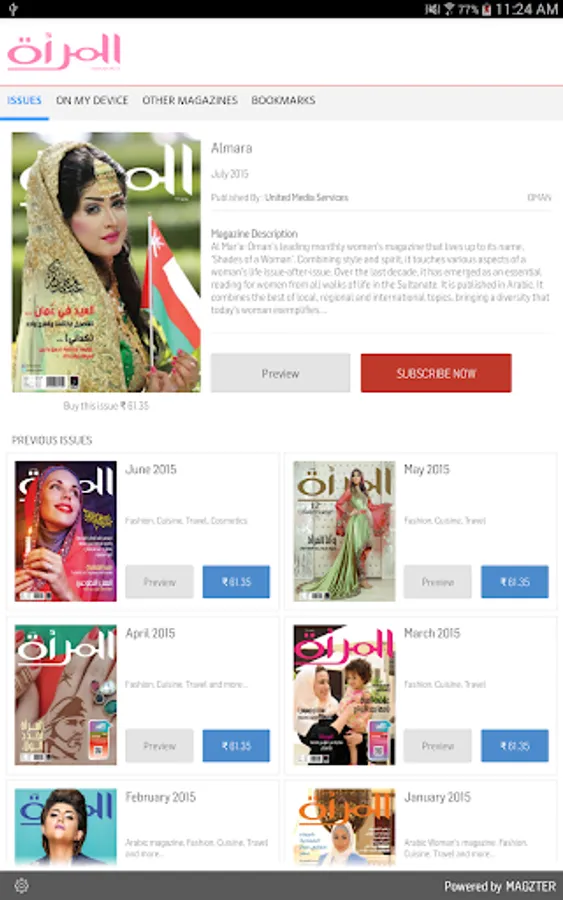 Al Mar'a: Oman's leading monthly women's magazine that lives up to its name, 'Shades of a Woman'. Combining style and spirit, it touches various aspects of a woman's life issue-after-issue. Over the last decade, it has emerged as an essential reading for women from all walks of life in the Sultanate. It is published in Arabic. It combines the best of local, regional and international topics, bringing a diversity that today's woman exemplifies.