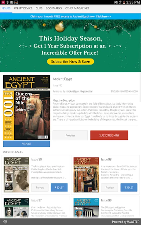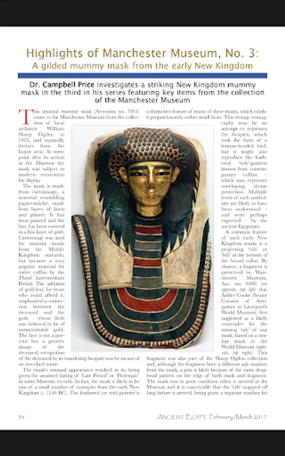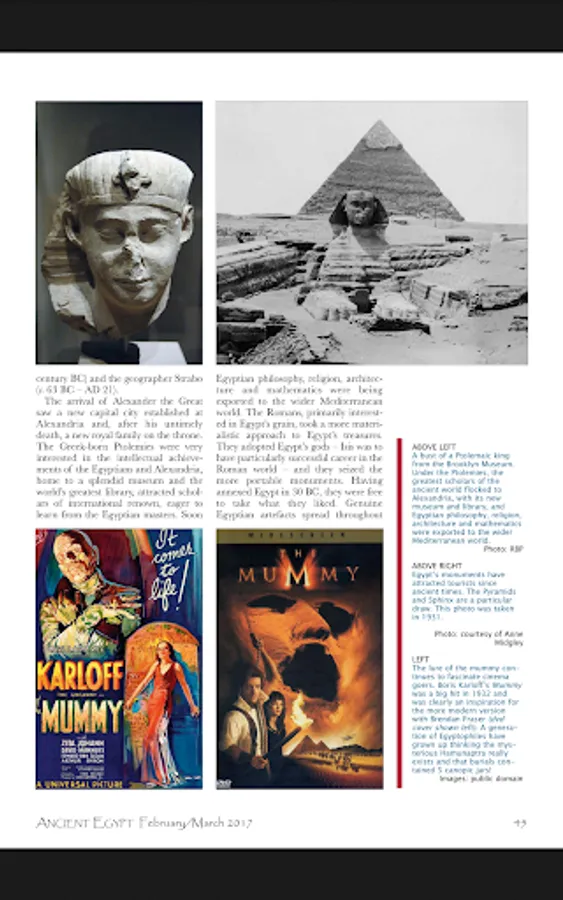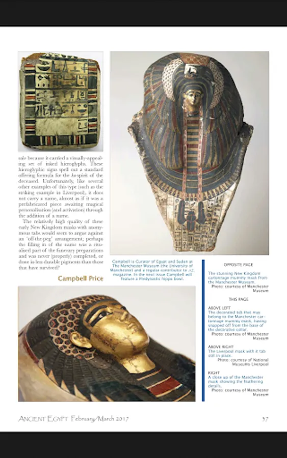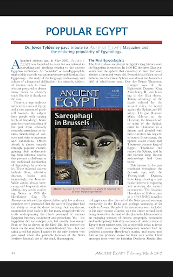 Ancient Egypt, written by experts in the field of Egyptology, is a lively informative global magazine appealing to Egyptology professionals and anyone with an interest in this fascinating early civilisation. Published bimonthly, this glossy well-presented magazine brings readers up to date with the latest news, discoveries, excavations and research into the history of Egypt from Predynastic times through to the modern era. There are in-depth articles on the building of the pyramids, the lives of the great Pharaohs, brewing and agriculture, health and disease, gods and goddesses, tombs and temples and ancient Egyptian art and culture. Find out about great Egyptologists and explorers, and ancient priests and peasants; discover more about Egyptian technology and the latest DNA and scanning techniques. How did Tutankhamun die? How did hieroglyphic writing work? What did ancient Egyptians eat for breakfast? All this plus guides to museum collections, reviews of the latest books and interactive media and event listings for all UK Egyptology Societies and major worldwide conferences and exhibitions. Love ancient Egypt? Then Ancient Egypt is the must-have magazine for you!
