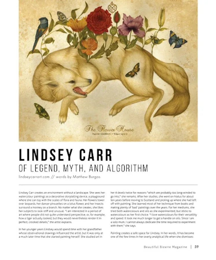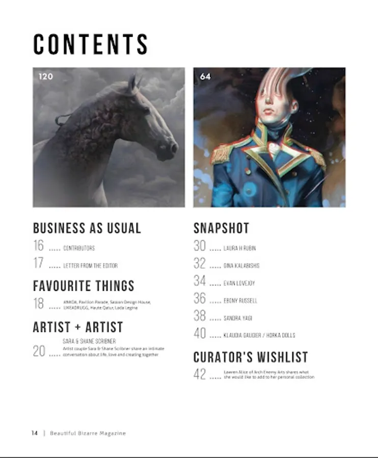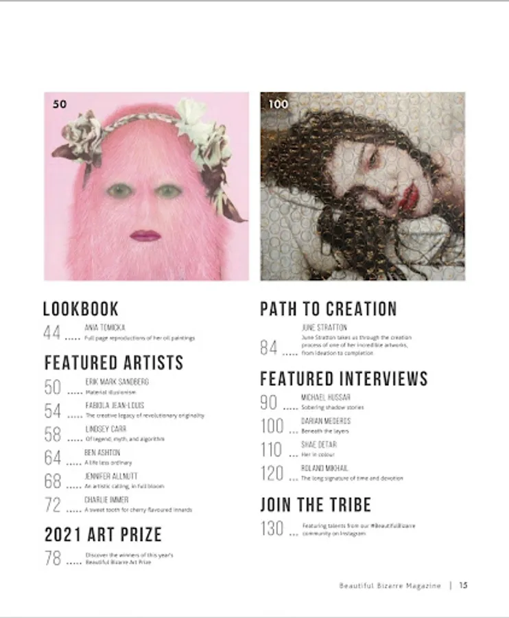 Beautiful Bizarre Magazine is packed full of insightful and inspiring articles and interviews with the best leading and emerging visual artists from around the world, informative step by step guides to artwork creation, intimate conversations between artists about life, love, travel, philosophy and art, highlights on some of our favourite wearable art brands, prominent Gallerists share their personal collection wishlists, studio visits, collector interviews, our Instagram community feature and much more!