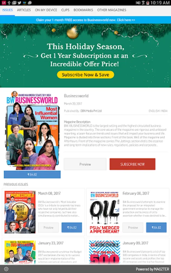 BW I BUSINESSWORLD is the largest selling and the highest circulated business magazine in the country. The core values of the magazine are rigorous and unbiased reporting, a laser-focus on trends and issues that will impact your business and life. Magazine is divided into three sections: Front of the book, Well of the magazine and Afterhours. Front of the magazine carries The Jottings section distils the essence and long-term implications of new rules, regulations, policies and corporate developments. It is a snapshot and a review of all the important things you need to keep in mind while planning your strategies. Well of the magazine contains the big in-depth stories and interviews, that focuses on the key business trends and issues that govern your future, or help you navigate the present better. Whereas, After Hours covers your life beyond the office and help make you a well-rounded executive. BW l BUSINESSWORLD is a fortnightly.