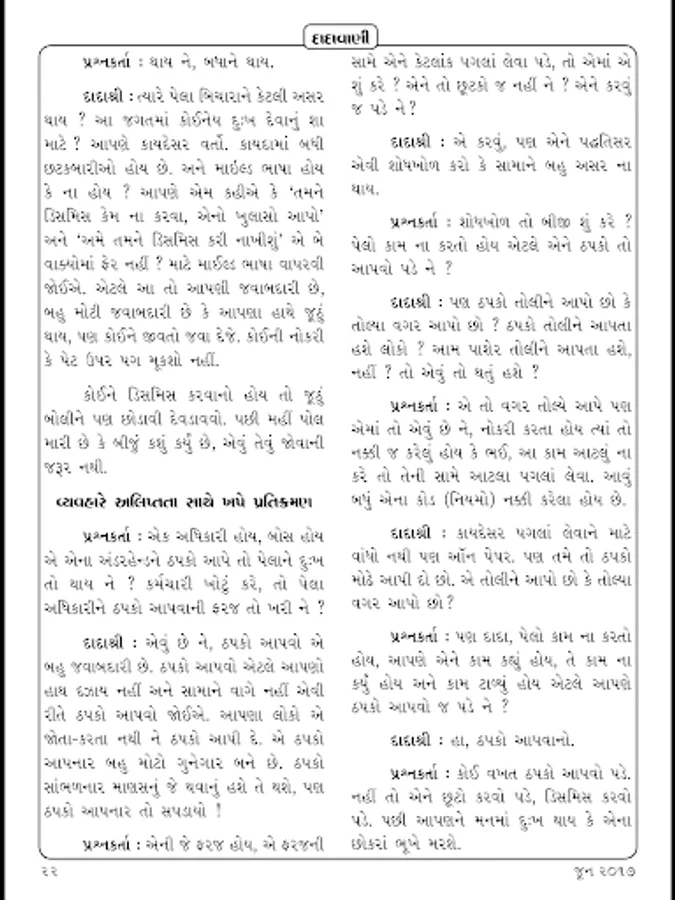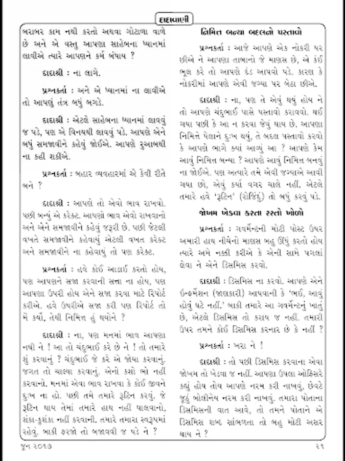 In the current edition, in many places Pujya Dadashri has given the Agnas as the solution of entanglements mahatmas face in worldly interactions. The explanation of how to remain in the subtle jagruti when facing difficulties in following the Agnas has been provided here. ‘I am pure Soul,’ ‘I am not at all the doer,’ ‘I am only the Knower-Seer’; this jagruti is the Real Purusharth. It is on the mahatmas that are sincerely doing Purusharth to experience the state of the pure Soul; Dada’s silent grace, His blessings will always be with them. The ardent prayer is that in this era of the time cycle, through Akram Gnan mahatmas ascend the ladder of the Purusharth to become ekavatari (a state whereby one will attain final liberation after just one more life) by following the Agnas.