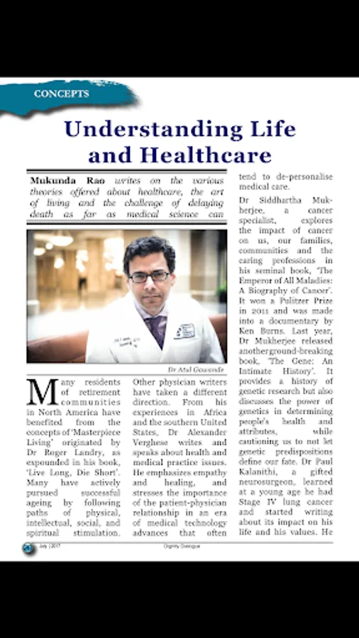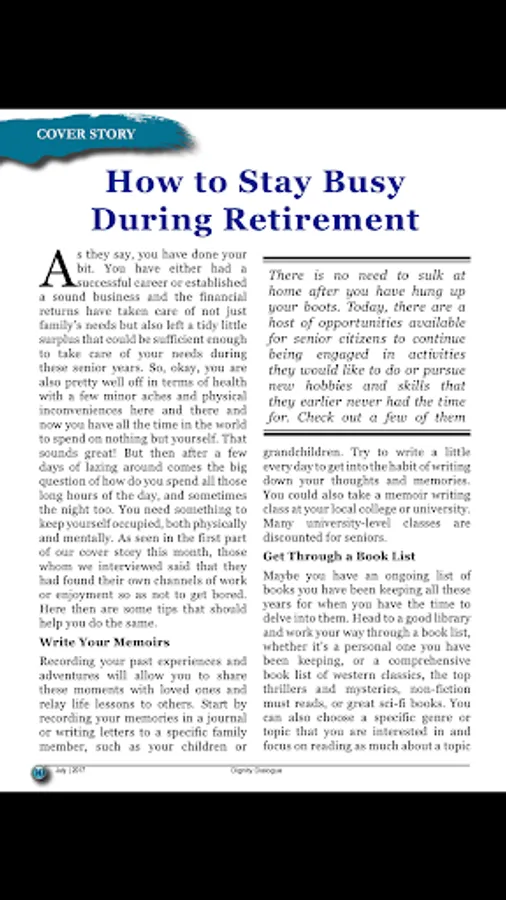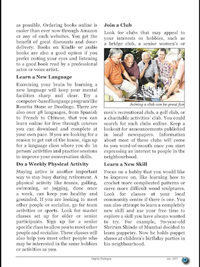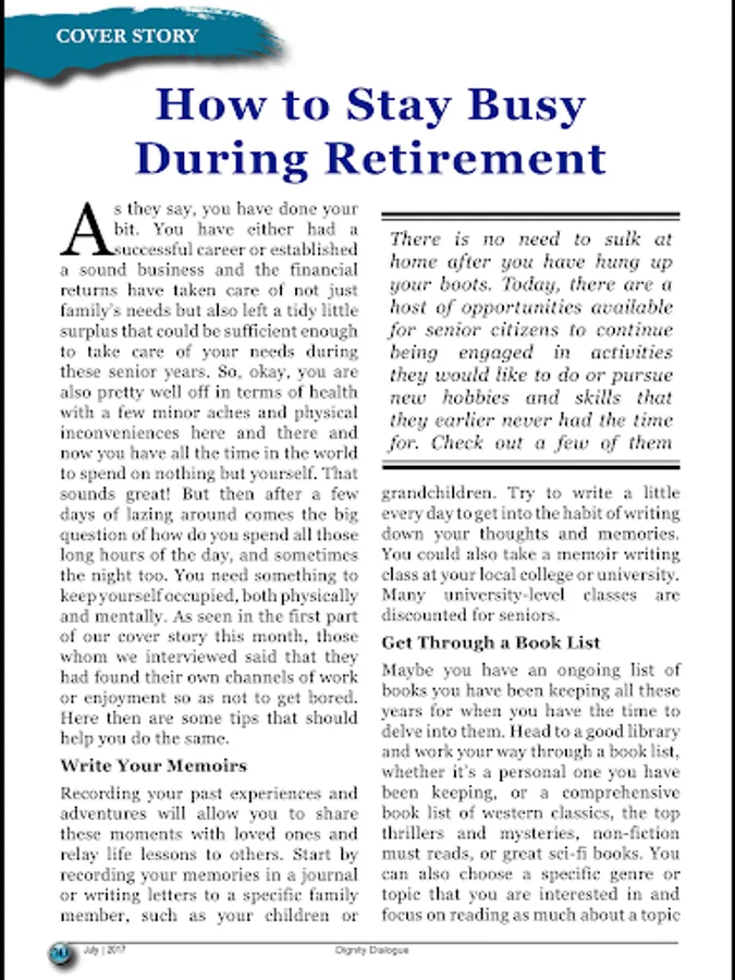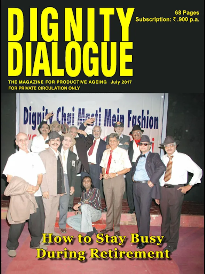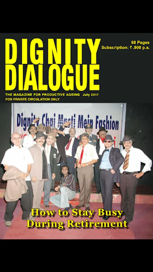 Dignity Dialogue - One of India’s foremost national magazines exclusively for the 50+ age group, ‘Dignity Dialogue’ was the frontrunner of Dignity Foundation, making its first appearance in 1995. Despite turbulences throughout these 16 years, it has been steadfast in its dispatch to subscribers on the 29th of every month. It has seen many avatars on the way, from a tabloid format to the current getup, from colour to black and white, and now back to a colourful modern model from 2010. What has been consistent over these years is the quality of its ‘contents’, which has been receiving rave reviews from its readers, who have become ‘passionate collectors’, carefully storing away copies of every issue over the years for an encore reading! It comes with an eclectic mix of health, wellness, spiritual awareness, environment, modern technology, personal finance, travel options, personalities to be emulated, senior cuisine, books for you, brain games like crossword and Sudoku, and contributions from readers on poetry, humour and nostalgic reflections as well as snippets of information from around the globe. In our endeavours to re-invent the magazine every year and make it more attractive for our readers, we have been adding professional columns on various lifestyle issues, consumer problems, photo features, and highlighting current issues, technology and the like, to keep you updated with the times, with an awareness on the environment around you. A special section focussing on the younger generation helps in strengthening intergenerational bonding. It has also found a place in the ‘retirement benefits’ of corporates such as RBI, ITC, BPCL, MICA and many more.