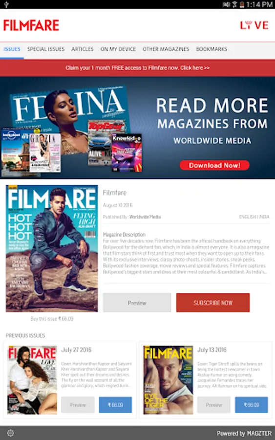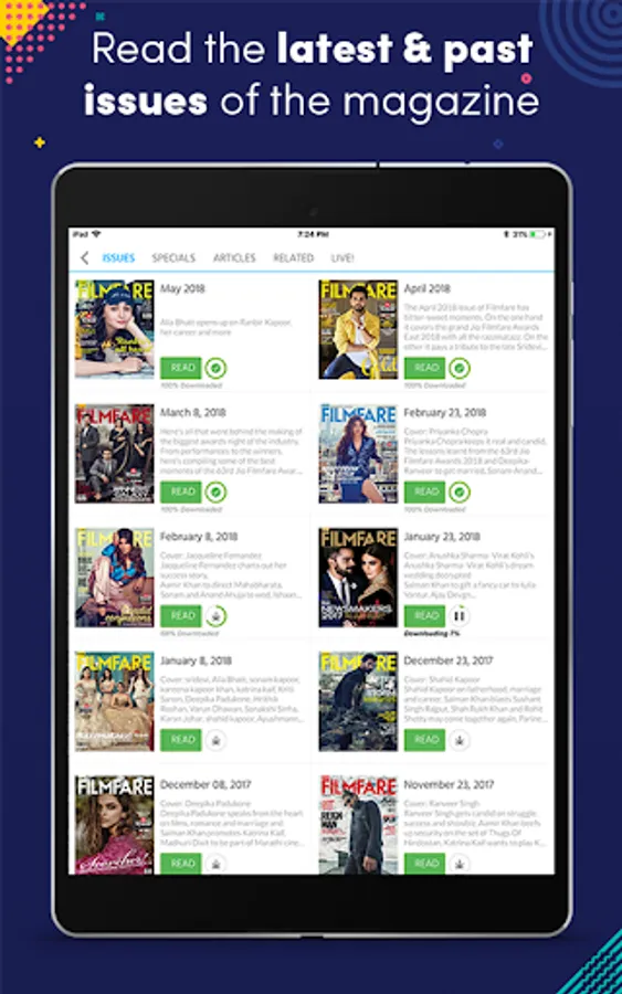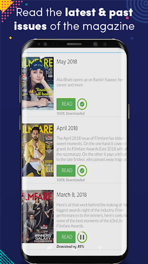 For over five decades now, Filmfare has been the official handbook on everything Bollywood for the diehard fan, which, in India is almost everyone. It is also a magazine that film stars think of first and trust most when they want to open up to their fans. With its exclusive interviews, classy photo-shoots, insider stories, sneak peeks, Bollywood fashion coverage, movie reviews and special features, Filmfare captures Bollywood's biggest stars and divas at their most colorful & candid best. As India's No. 1 entertainment magazine, Filmfare has through the years, turned from a monthly into a fortnightly, and launched an edition devoted to the southern film industry and gained a readership of more than 2 million fans! There's no better evidence of Filmfare's hold on the industry than the Filmfare Awards.