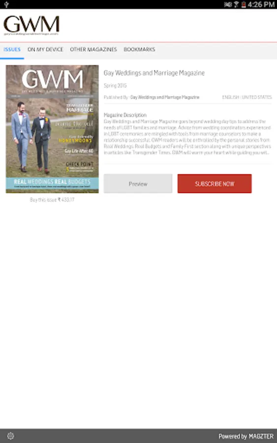 Gay Weddings and Marriage Magazine goes beyond wedding day tips to address the needs of LGBT families and marriage. Advice from wedding coordinators experienced in LGBT ceremonies are mingled with tools from marriage counselors to make a relationship successful. GWM readers will be enthralled by the personal stories from Real Weddings: Real Budgets and Family First section along with unique perspectives in articles like Transgender Times. GWM will warm your heart while guiding you with wedding, marriage and family advice.