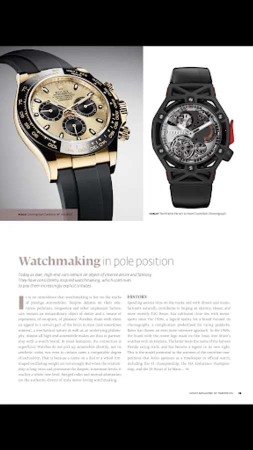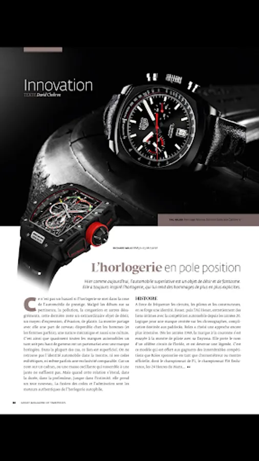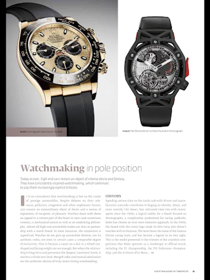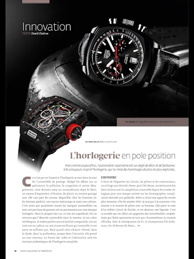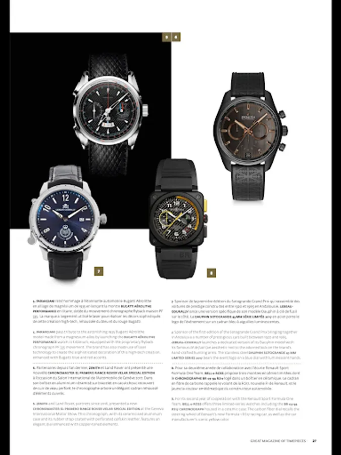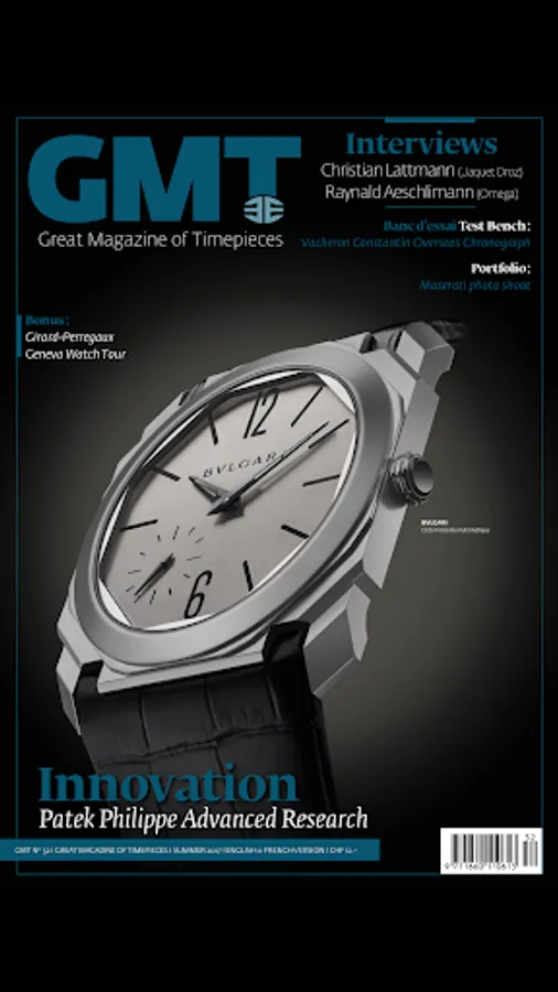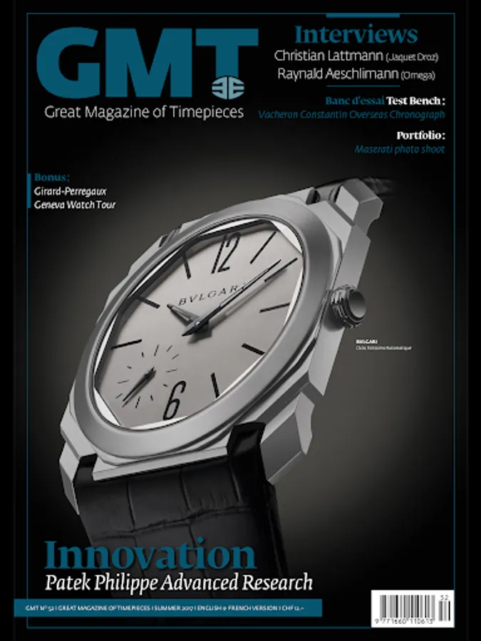 GMT is the reference Swiss watch magazine, reflecting the spirit of high watchmaking since 2000. GMT created the Geneva Watch Tour and institutionalized the art of measuring time as the 12th Art. Novelties, test bench, interviews, architecture, economics, leaders, events, GMT covers the universe of fine watchmaking and unveils the most amazing timepieces. Watch enthusiasts will appreciate the beautiful pictures featured in GMT just as its exclusive articles in English/French or English/German