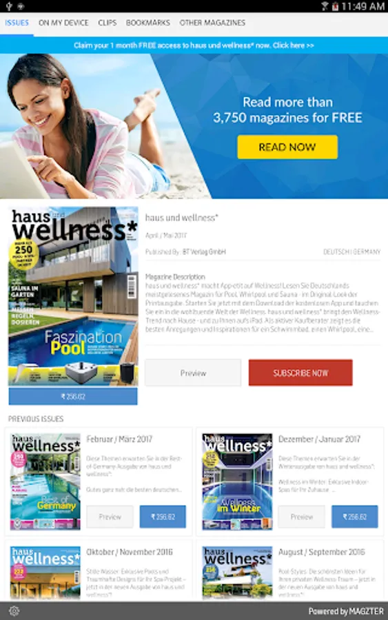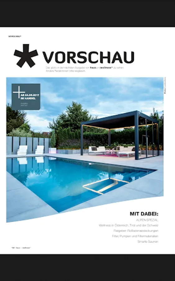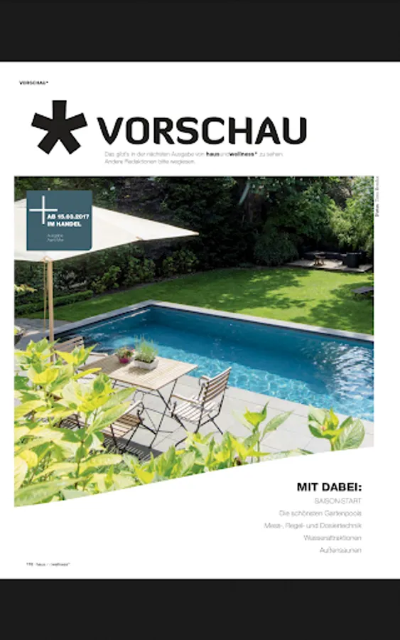 haus und wellness* macht App-etit auf Wellness! Lesen Sie Deutschlands meistgelesenes Magazin für Pool, Whirlpool und Sauna - im Original-Look der Printausgabe. Starten Sie jetzt mit dem Download der kostenlosen App und tauchen Sie ein in die wohltuende Welt der Wellness. haus und wellness* bringt den Wellness-Trend nach Hause - und zu Ihnen aufs iPad. Als aktiver Kaufberater zeigt es die besten Anregungen und Inspirationen für ein Schwimmbad, einen Whirlpool, eine Sauna oder ein Dampfbad in den eigenen vier Wänden. In ausführlichen Reportagen im 3D-Look, werden gelungene Wellness-Oasen vorgestellt und in detaillierten Beschreibungen wird klar, worauf es bei Einbau und Wartung moderner Anlagen ankommt. Die neuesten Trends werden von unserer Redaktion aufgegriffen und in einem ansprechenden Layout präsentiert. Aber auch Tipps und Ratschläge von ausgewiesenen Experten etwa zu den Themen Wasserpflege, Betriebskosten und Steueranlagen stellen einen Schwerpunkt in haus und wellness* dar. haus und wellness* ist die App für entspannte Hausbesitzer - in völlig neuem Look and Feel. Mit dieser App gehen Sie bestimmt nicht baden. Schicken Sie uns Ihr Feedback an app@hausundwellness.de. Ihre haus und wellness*-Redaktion