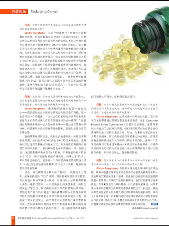 通过与美国知名杂志 Pharmaceutical Manufacturing 和Contract Pharma 的合作以及国内行业协会和专家的大力支持,《国际医药商情》在过去的 9 年里成为中国制药行业内的领先媒体。通过为读者——药物制剂、加工和包装行业的决策者提供互动交流平台,《国际医药商情》不仅仅能够提供从药用原辅料到药物传递系统、加工技术、质量控制、自动化以及包装领域的深入报道,同时还将通过多媒体的形式进行展示。这包括电子杂志,每天更新的制药行业网站,每月一次的电子快讯以及全面互动的杂志应用,包括I Tunes和Google Play上的视频链接。通过电子以及印刷版杂志上这些丰富的资讯内容,《国际医药商情》为中国药品生产商与原辅料、机械和包装供应商之间提供一个最有效的交流平台。