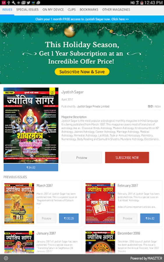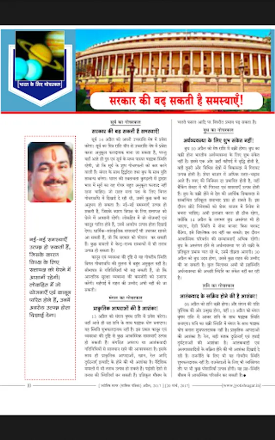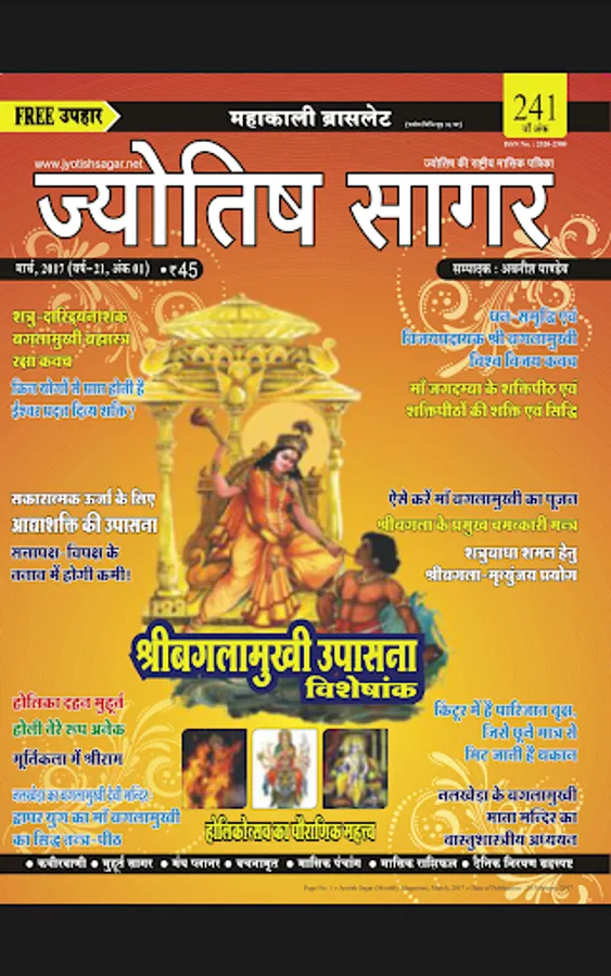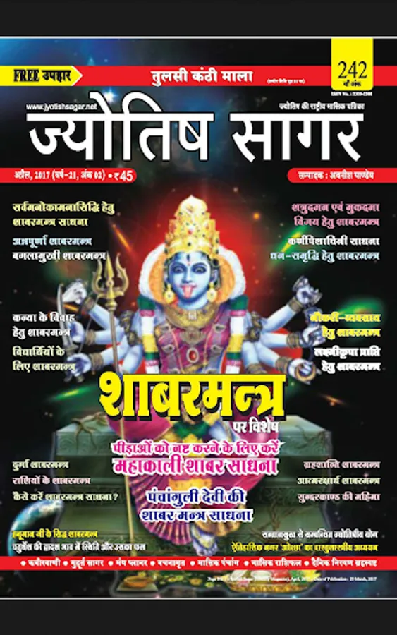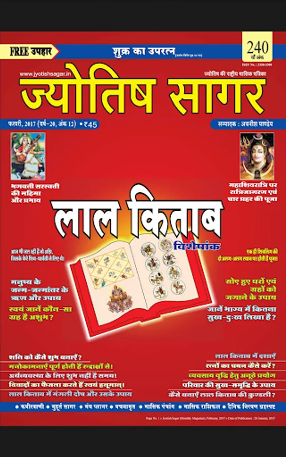 Jyotish Sagar is the most popular astrological monthly magazine in Hindi language. It is being published from March, 1997. This magazine covers most of branches of astrology like as : Classical Hindu Astrology, Modern Astrology, Krishnamurthi or KP Astrology, Jaimini Astrology, Career Astrology, Marriage Astrology, Medical Astrology, Remedial Astrology, Lal Kitab, Tajik or Annual Horoscopy, Palmistry, Numerology, Body Reading and Samudrik Shastra, Mundane Astrology, Electional or Muhurta Astrology, Vedic Astrology, Astrological Mathematics and Siddhant Jyotish or Hindu Astronomy etc. Detailed Panchanga (calendar), Monthly Ephemeris and Various type of Muhurta are also published in every issue. Monthly Horoscope (Rashiphal) and Tansitary Forecast are also attractive feature of Jyotish Sagar. Many permanent collums like as festival planner of the month, Ramcharitmans, Upanishad, Gita, Ravan Samhita, Puran Purush, Kabir Vaani, Chanakyodesh etc are other attractions of this magazine. Some articles are also published on Vastu, Tantra, Mantra and Yantra. Every year two Special issues on Deepavali are also published. More than four special issues are published per year.