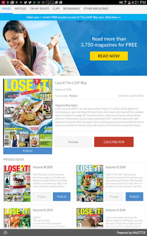 Lose It! is a brand devoted to a low-carb lifestyle. Its content pillars are: expert advice, delicious recipes designed by nutritionists, and inspiring success stories. With the trendsetting and revolutionary Banting diet as a platform, this 84-page glossy, produced by the experienced FAIRLADY team in collaboration with recognised experts in the field, fills a unique gap in the market. It is flying off the shelves!Volume 45