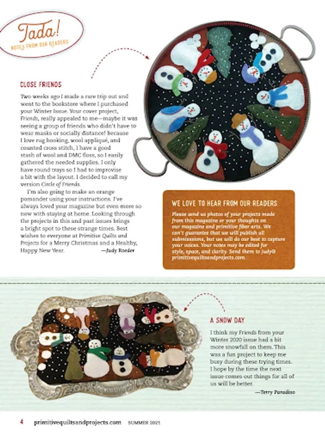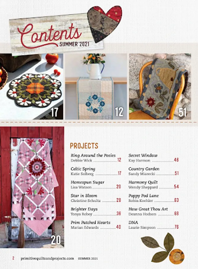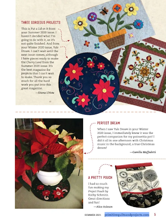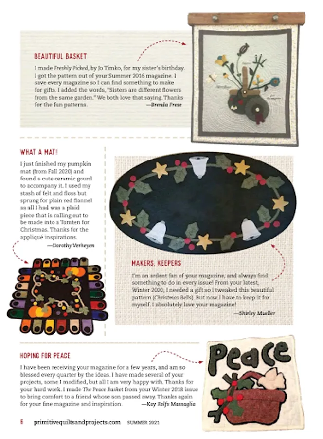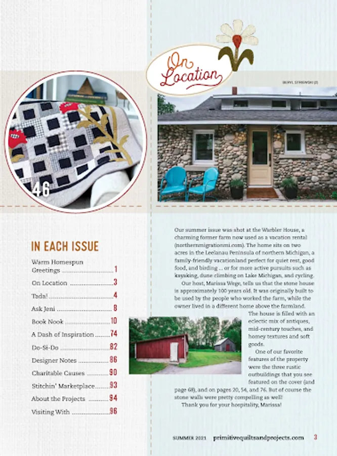 This is a beautiful project-based magazine with no less than 15 complete patterns for quilting, rug hooking, stitching, applique and more! This is the only publication dedicated to the primitive artisn. All your favorite designers PLUS new and upcoming talents. Publishing quarterly, this magazine is also available in print form.