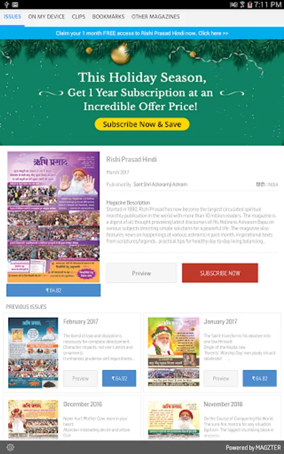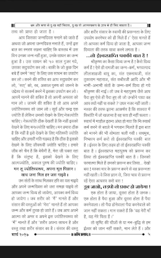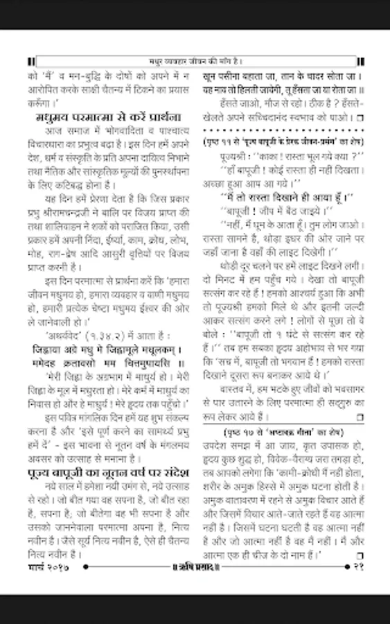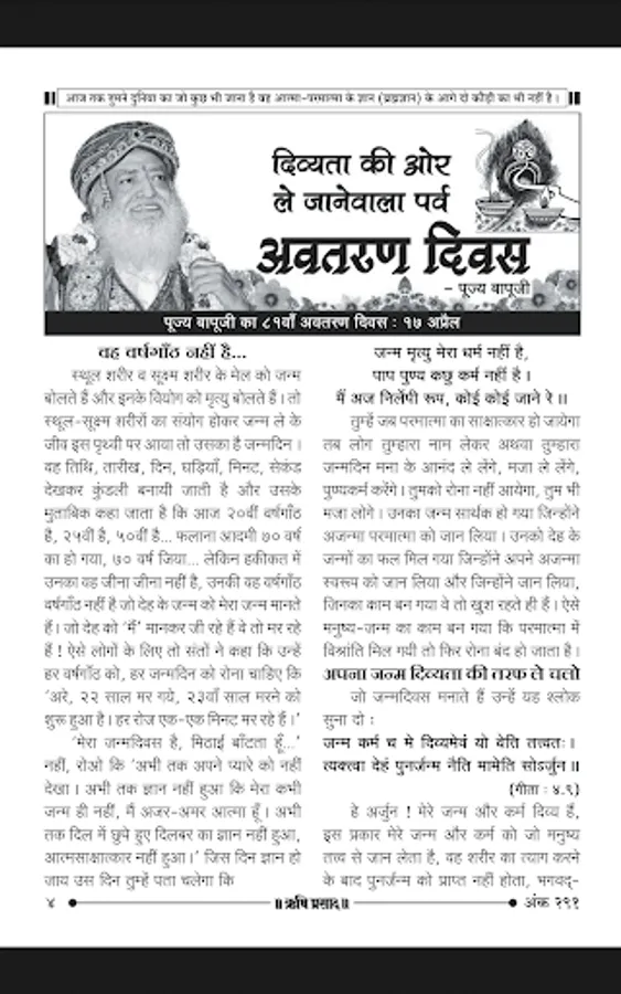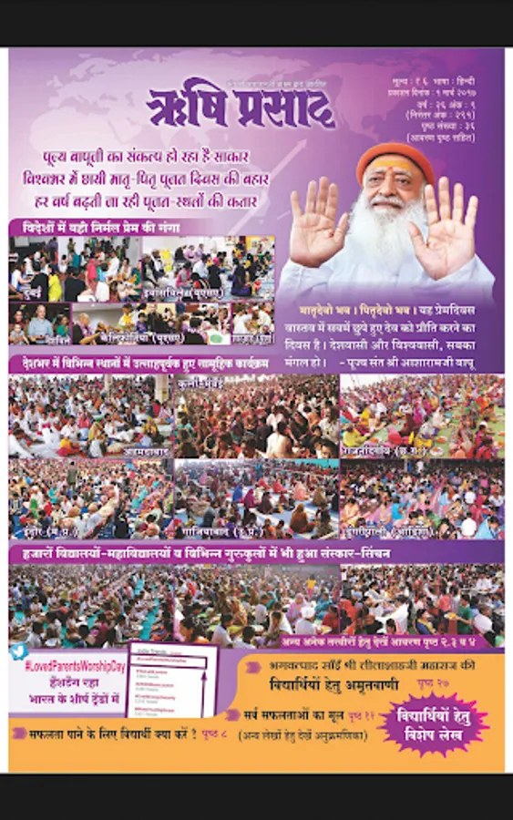 Started in 1990, Rishi Prasad has now become the largest circulated spiritual monthly publication in the world with more than 10 million readers. The magazine is a digest of all thought provoking latest discourses of His Holiness Asharam Bapu on various subjects directing simple solutions for a peaceful life. The magazine also features news on happenings at various ashrams in past month, inspirational texts from scriptures/legends , practical tips for healthy day-to-day living balancing materialism by idealism, Bapuji's answers to questions raised by seekers, disciples's experiences etc.