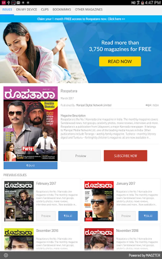 Roopatara is the No. 1 Kannada cine magazine in India. The monthly magazine covers Sandalwood news, hot gossips, celebrity photos, movie reviews, interviews and more. Roopatara is a publication from Udayavani, a major Kannada newspaper. It belongs to Manipal Media Network Ltd., one of the leading media houses in India. Other publications include Taranga – weekly family magazine, Tushara – monthly literary digest and Tunturu – fortnightly children’s magazine; all are now available in Magzter!