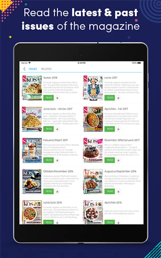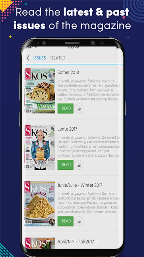 SARIE Kos gaan oor kos wat die mond laat water en is trots SA. Die tydskrif is vir enigeen wat geïnspireer word deur smake en geure, wat geliefdes wil bederf met geregte so reg uit die hart. G’n fieterjasies of aansitterigheid nie, net goeie, eerlike kos en gesonde idees vir almal wat die wêreld van kos wil ontdek en die heilsaamheid daarvan wil geniet.