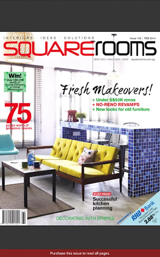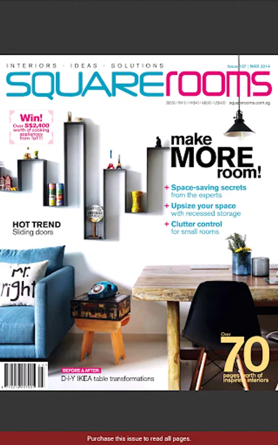 The BIGGEST SquareRooms issue ever, brace yourself for an overload of home ideas, tips and solutions in our 100th issue! Over 200 tips to stretch your space + style secrets, 100 hottest seats & 100 pages of amazing makeovers! Whatsmore, stand a chance to win a S$20,000 living room + bedroom MAKEOVER! Get your copy NOW!.