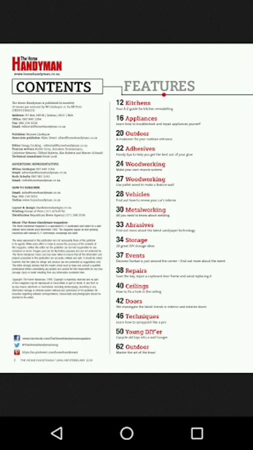 The Home Handyman magazine is a specialized D.I.Y. publication and caters for a well-defined niche market since November 1993. Editorial includes new products for D.I.Y.’ers, along with projects, home improvement ideas and expert advice. Expert advice from various fields (such as adhesives, abrasives, power tools, welding, plumbing, paint, lighting, waterproofing, wood and metalworking), provides readers with simple, cost effective solutions and methods in a series of practical, step-by-step features that are comprehensively illustrated. All projects feature local products and metric measurements, making the ideas easy to implement.