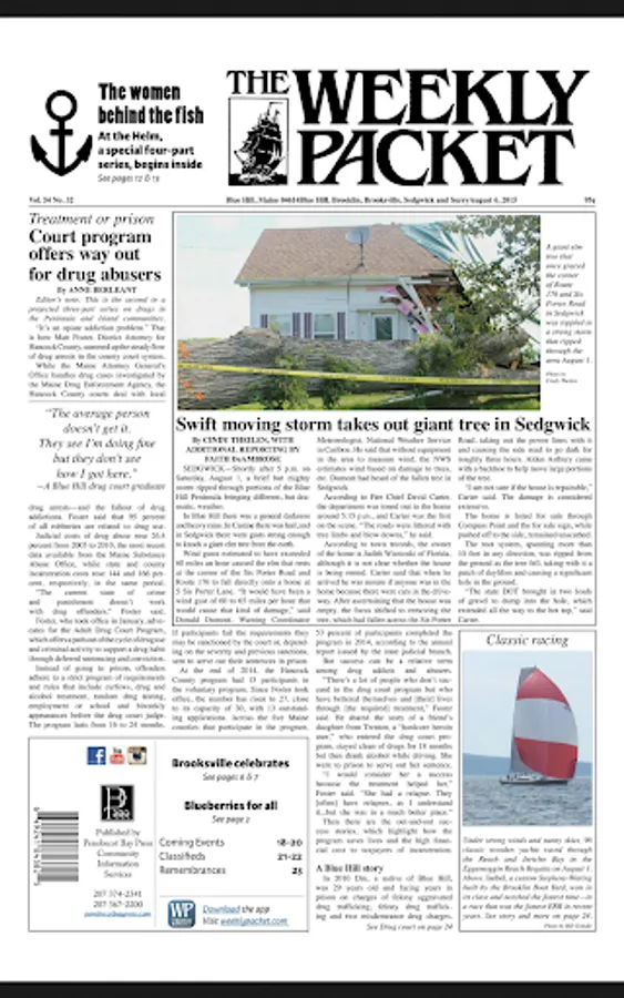 The Weekly Packet has been serving the Blue Hill Peninsula for the last five decades. It shares the stories and news of Blue Hill, Brooklin, Brooksville, Sedgwick and Surry, Maine. Steeped rich in traditions such as fishing, boat building and agriculture, the newspaper follows the lives of its people and industry while also serving as the local paper of record and reporting on the municipal and educational decisions that affect the lives of the people that call the peninsula their home. Blue Hill, with its hospital and diverse alternative health care providers, as well as its many businesses and cultural institutions, serves as a nexus for the area.