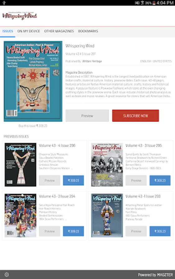 Established in 1967, Whispering Wind is the longest lived publication on American Indian crafts, material culture, history, powwow dates. Each issue, 40-48 pages, features articles on Native American material culture, crafts, history and historical images. A popular feature is Powwow Fashions which looks at the ever changing clothing styles in the powwow arena. Each issue includes historical photo analysis as well as book and music reviews. A great resource for stores that sell American Indian related crafts and interests.