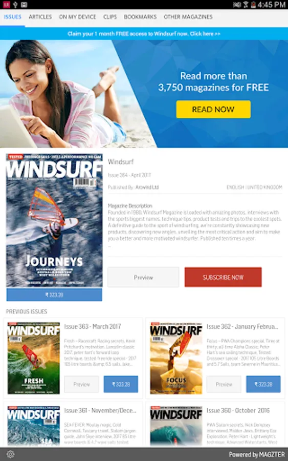 Founded in 1980, Windsurf Magazine is loaded with amazing photos, interviews with the sports biggest names, technique tips, product tests and trips to the coolest spots. A definitive guide to the sport of windsurfing, we're constantly showcasing new products, discovering new angles, unveiling the most critical action and aim to make you a better and more motivated windsurfer. Published ten times a year.