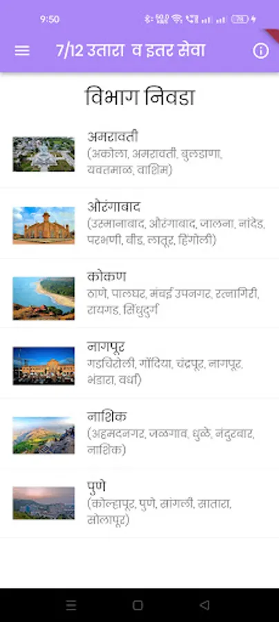 All the districts of Maharashtra state are classified into Pune, Konkan, Nashik, Nagpur, Amravati, Aurangabad departments in this App.