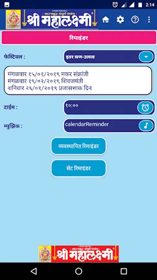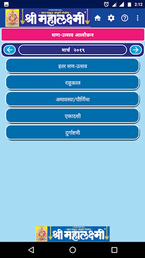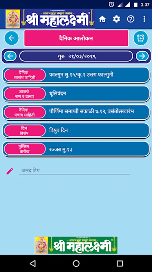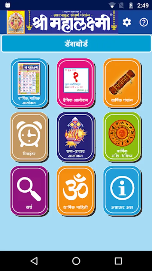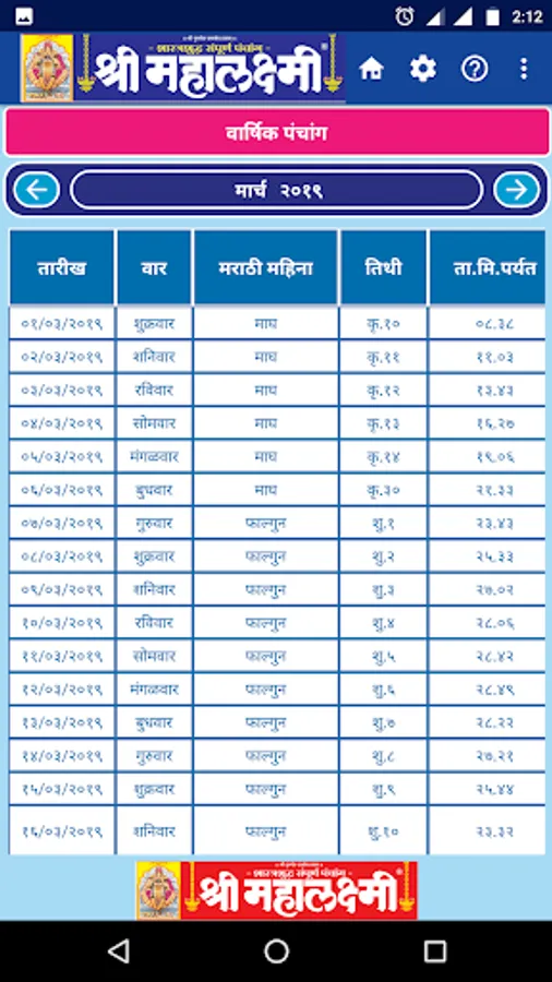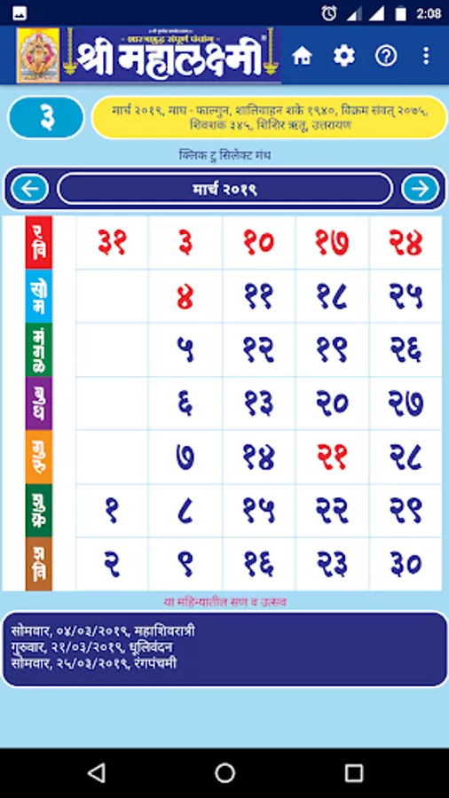 Since 1944 we are publishing Marathi Panchang & Calendar, which became popular by name Shri Mahalaxmi. Shri Mahalaxmi Dinadarshika, is one of the most trusted Panchang Calendar in India, which is also available through this app. All your calendar requirements will be met by this: Information on Panchang, religious and auspicious days as per Hindu calendar, holidays,events, and Day's details are available at your tips. Please download this easy to use app for your daily calendar needs.