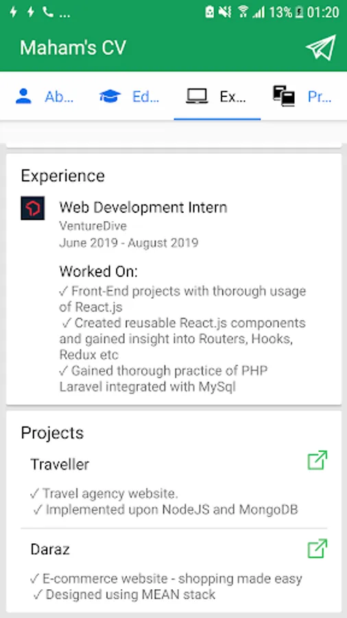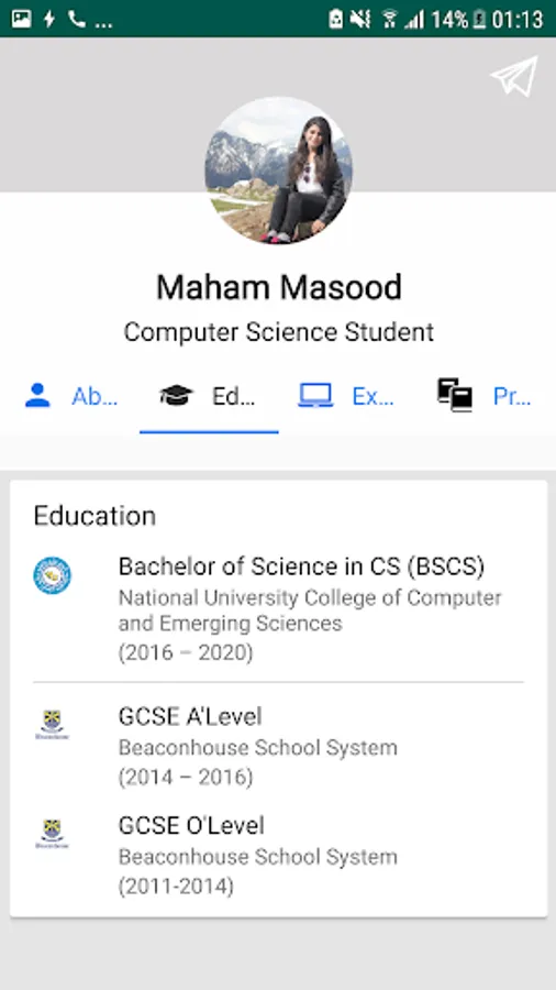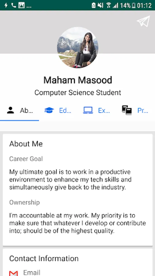 Maham Masood is an aspiring computer scientist. This instant app is meant to show a brief outlook of her resume. It contains all of her professional details, including all platform links, past education, professional experiences, and projects.