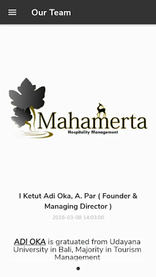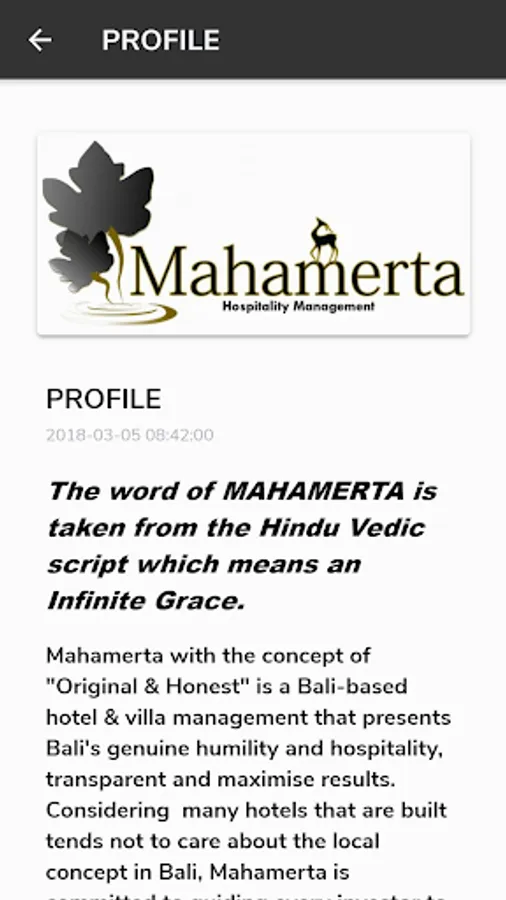 The word of Mahamerta is taken from the Hindu Vedic script which means an infinite grace. Mahamerta with the concept of "Original & Honest" is a Bali-based hotel & villa management that presents Bali's genuine humility and hospitality, transparent and maximize results. Considering many hotels that are built tends not to care about the local concept in Bali, Mahamerta is committed to guiding every investor to a sustainable investment with respect to Balinese Culture.