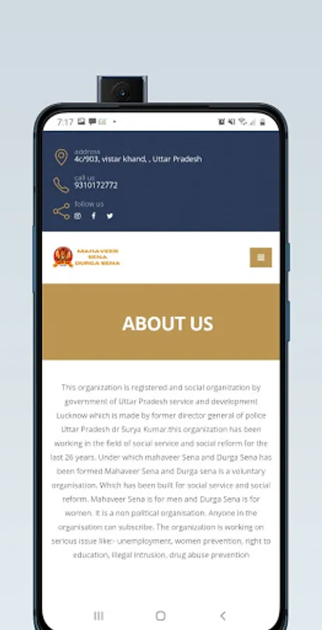 This organization is registered and social organization by government of Uttar Pradesh service and development Lucknow which is made by former director general of police Uttar Pradesh dr Surya Kumar.this organization has been working in the field of social service and social reform for the last 26 years. Under which mahaveer Sena and Durga Sena has been formed.Mahaveer Sena and Durga sena is a voluntary organisation. Which has been built for social service and social reform. Mahaveer Sena is for men and Durga Sena is for women. It is a non political organisation. Anyone in the organisation can subscribe. The organization is working on serious issue like:- unemployment, women prevention, right to education, illegal intrusion, drug abuse prevention