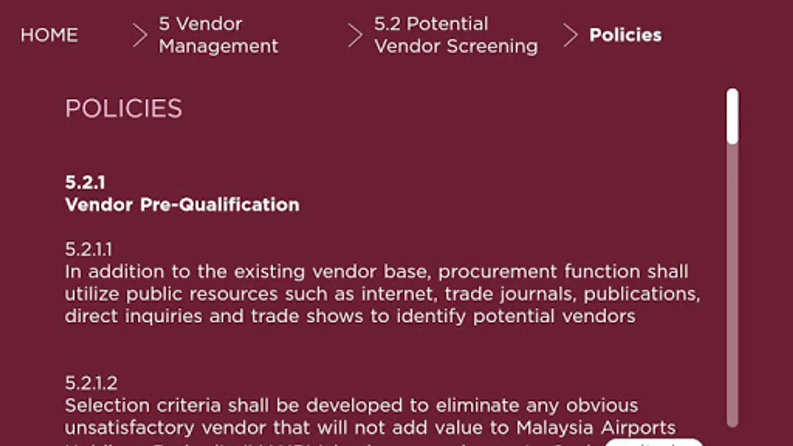 - Enhance user experience when navigating the Procurement Manual to obtain relevant and updated procurement policies and processes and Malaysia Airports procurement information and activities
