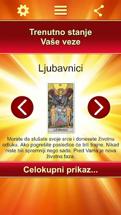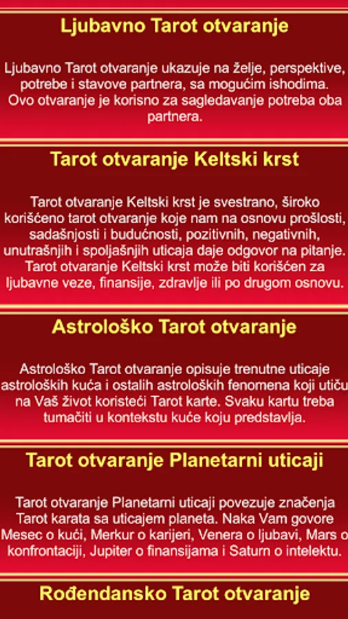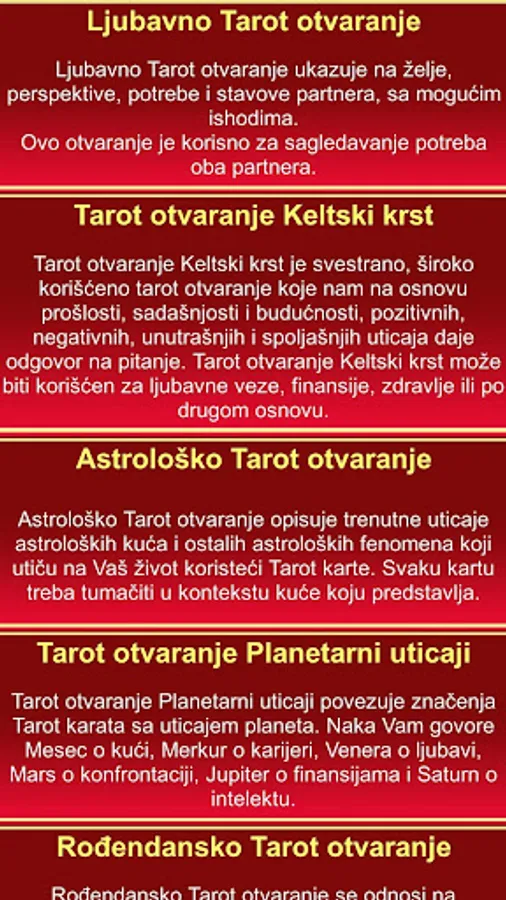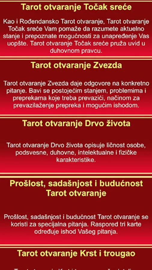 Divination is done using a deck of 78 cards that can be opened properly or vice versa. Each tarot opening is done in a special way, with the appropriate number of cards. Each method has from 3 to 13 cards relating to special conditions, persons, events, or feelings of a situation, so that the huge number of possible combinations. Additional tips and explanations on what it refers to each card in the required method, each method make it unique and important. For some methods, it is necessary to think of a question, a wish or follow the instructions, which is why it is necessary to pay attention to the messages you send Sibyl.
