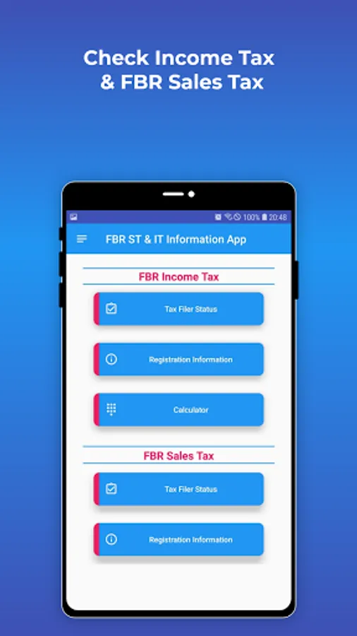 Through App you can check if person or business is registered from FBR and paying taxes or not. App have accurate calculator for quickly getting the tax amount, monthly and yearly basis.