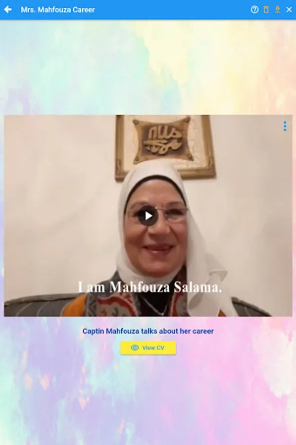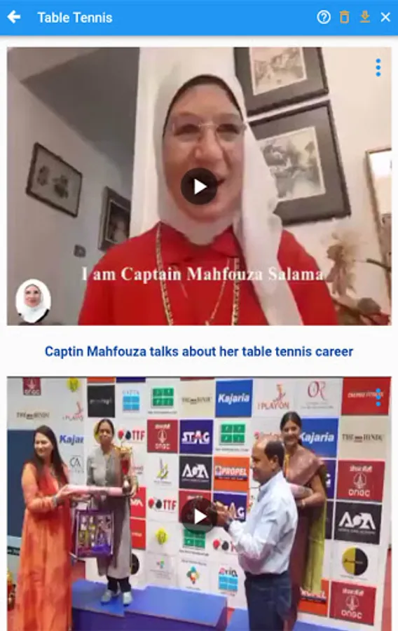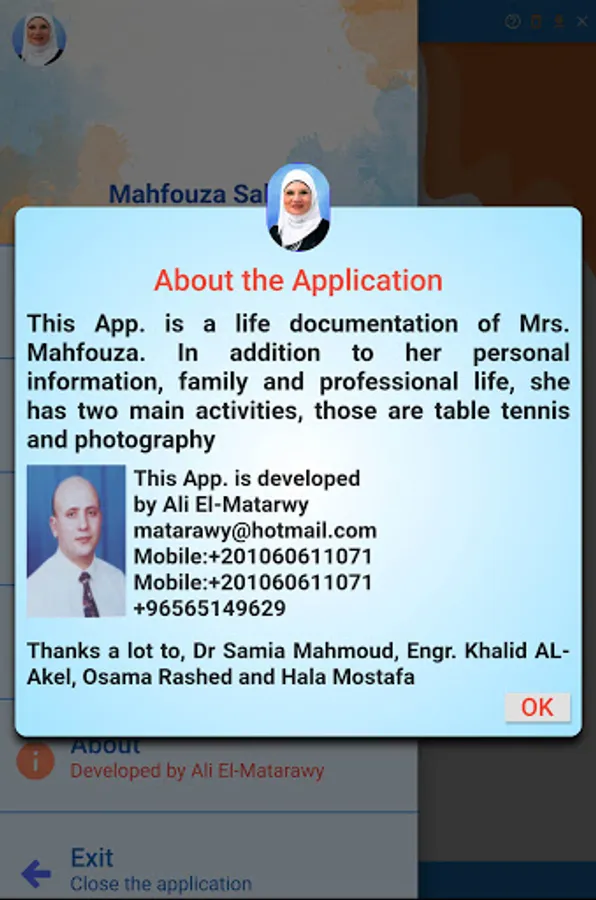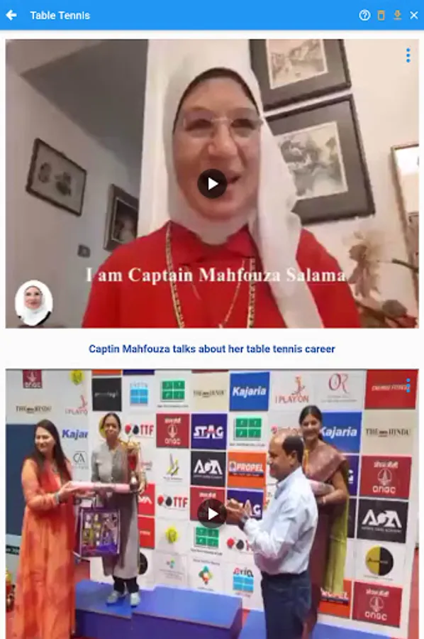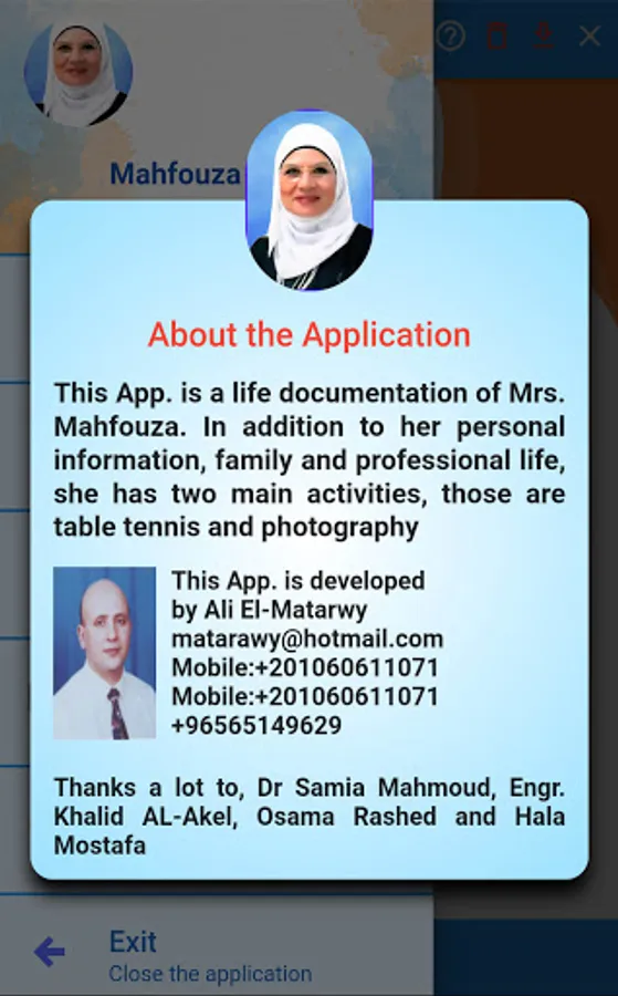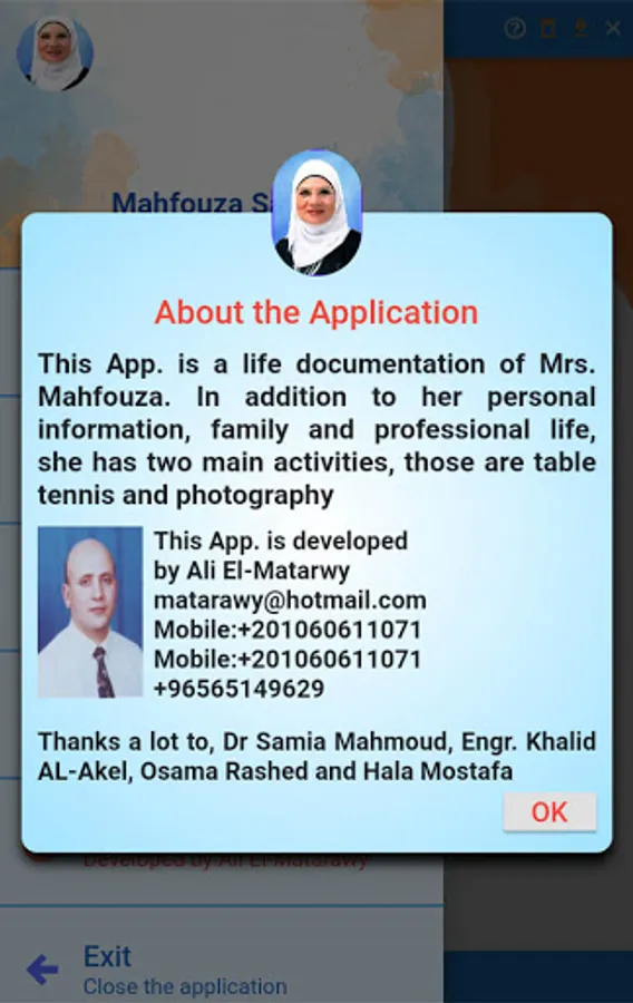 This App. is a life documentation of Mrs. Mahfouza Salama. In addition to her personal information, career, family and professional life, she has two main activities, those are table tennis and photography. This application gives a full detailed information by videos and photos for her career, family, sport activity (table tennis) and photographic activity. Believe it or not Mrs. Mahfouza started playing table tennis at age of almost 64 years old and she got the first rank in the India international championships in an event is younger than her age, also in Egypt, she got the first, second, or third rank in all tournaments she participated in the event of her age. Also she started photographic activity after she had 60 years old and got many appreciation certificates in most of exhibitions she participated in