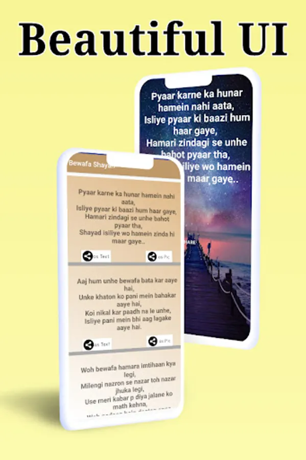 Bewafa and Dard Shayari app has lots of amazing many features you can easily use it without the internet. In this dhokha shayari Hindi app has hindi shayari with multiple categories like pyar bhari love shayari , premika shayari, Alone shayari, Romantic Shayari, Miss you Shayari, Pyar Shayari, Mohabbat Shayari, lover shayari in hindi etc.