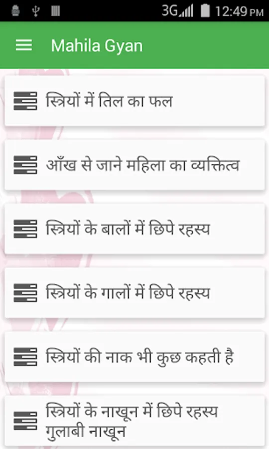 This app provides you complete information about women from their health to wealth in hindi.