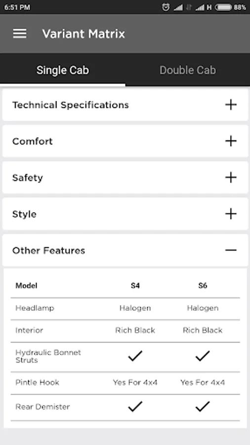 The app also provides a quick comparision of the competiton models in your market & how it is placed wrt pricing & features. You can download the advertisements & some video content for the pikup from this app.