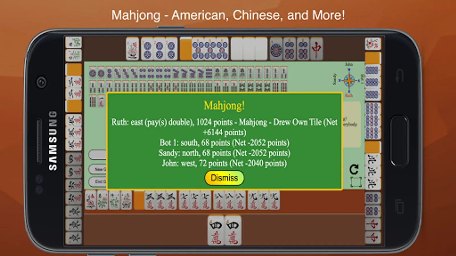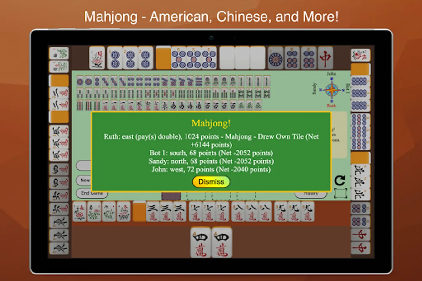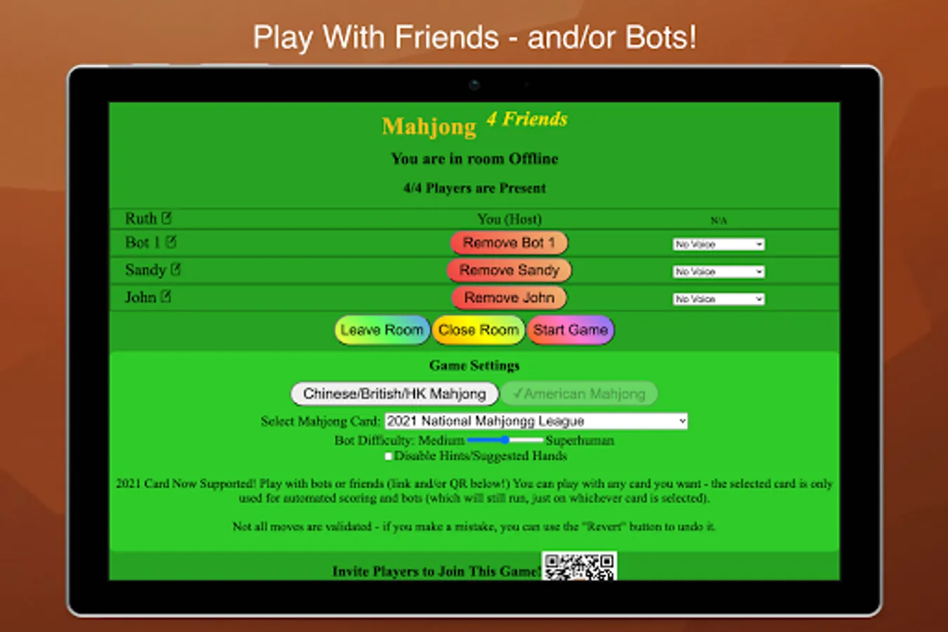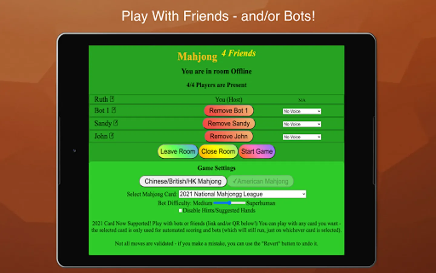 Mahjong 4 Friends allows you to play mahjong with your friends and/or bots! American, Chinese, Hong Kong, and British Mahjong are supported. Can't play your way? Send us an email!